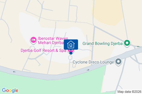 Štyrihviezdičkový hotel sa nachádza v 13-hektárovom palmovom háji v srdci ostrova Djerba. Najbližšie obchody, bary a reštaurácie nájdete v centre dedinky Midoun, ktorá je od hotela vzdialená približne 6 km. Vzdialenosť od hlavnej dediny a hlavného mesta ostrova Houmt Souk je približne 18 km a od letiska Djerba - Zarzis približne 25 km. Naproti hotelu sa nachádza 27-jamkové golfové ihrisko. POZNÁMKA!Cena nezahŕňa miestnu turistickú daň vo výške 3 TND/osoba/deň. Maximálna turistická daň sa počíta za 7 po sebe nasledujúcich hotelových nocí aj pri dlhších pobytoch. Osoby mladšie ako 12 rokov sú od platenia turistickej dane oslobodené. Daň je povinná a platí sa priamo na recepcii pred ubytovaním klientov v hoteli.