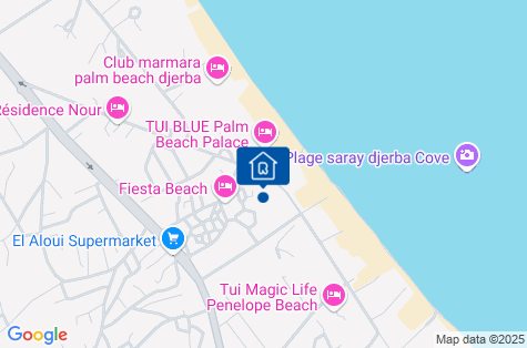 Hotel sa nachádza v pokojnej oblasti, asi 5 km od centra mesta Midoun a asi 15 km od hlavného mesta ostrova Houmt Souk s tradičným arabským trhom. Asi 400 metrov od hotela sa nachádzajú obchody a bary. Letisko Djerba - Zarzis je vzdialené približne 25 km. POZNÁMKA!Cena nezahŕňa miestnu turistickú daň vo výške 3 TND/osoba/deň. Maximálna turistická daň sa počíta za 7 po sebe nasledujúcich hotelových nocí aj v prípade dlhšieho pobytu. Osoby mladšie ako 12 rokov sú od platenia turistickej dane oslobodené. Daň je povinná a platí sa priamo na recepcii pred ubytovaním klientov v hoteli.