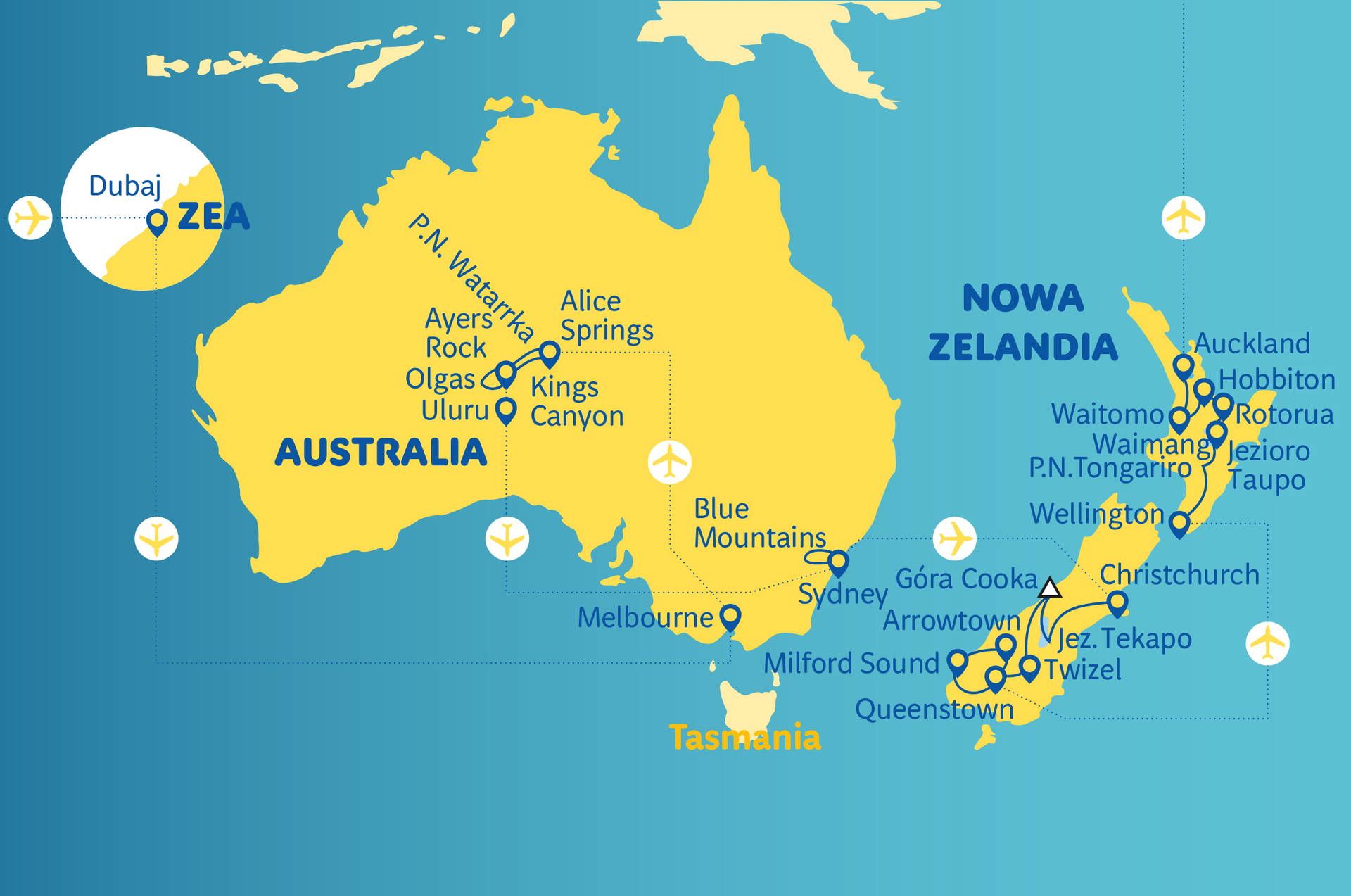 Dubaj - nejoblíbenější hlavní město Spojených arabských emirátů • Adelaide a Alice Springs - nejkrásnější města Austrálie • Barossa - údolí vína • Kings Canyon - červený střed Austrálie • Ayers Rock - Uluru - posvátná hora Aboridžinců • Sydney - opera a přístavní most • Národní park Blue Mountains a Three Sisters • plavba po zátoce Botany Bay do Manly s krásnou pláží a historickými budovami • Nový Zéland - oba ostrovy • Národní park s Mount Cook - nejvyšší horou Nového Zélandu • Milford Sound - fjord u Tasmánského moře • Wellington - hlavní město Nového Zélandu • Auckland - největší město Nového Zélandu • horká Rotorua • Hobitín - setkání s hobity • Waitomo - hvězdná obloha v jeskyních