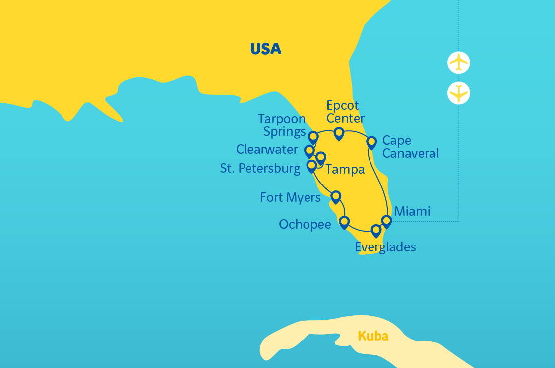 Miami - nejkrásnější pláže Floridy • Duck Boat na South Beach • Star Island - rezidence hvězd • St. Petersburg - kolekce Salvadora Dalího • Epcot Center - zábavní park v Orlandu - zábava pro malé i velké • Cape Canaveral a základna NASA • Everglades - řeka trávy