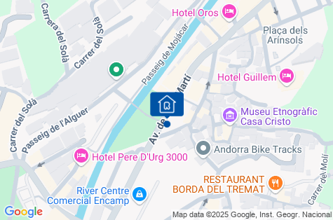 Utulný hotel sa nachádza v centre Encampu, štvrtej najväčšej dediny v Andorre, v nadmorskej výške 1300 m. Hotelová bezplatná kyvadlová doprava (zastávka pri hoteli) odvezie hostí na lyžiarsku stanicu v Grandvalire (cca 1500 m). V Encamp, ktoré sa nachádza pri vstupe do Grandvaliry a len asi 10 minút jazdy od hlavného mesta Andorry, nájdete bary, reštaurácie a obchody. Transfer na letisko v Barcelone trvá približne 3,5 hodiny.
