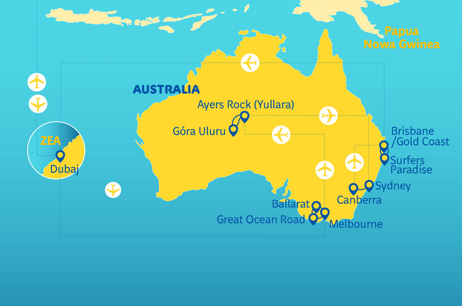 Cena zahrnuje:Let pravidelnou linkou z Varšavy do Austrálie a z Austrálie do Varšavy s mezipřistáním: Varšava - Dubaj (nocleh a prohlídka) - Melbourne a Brisbane - Varšava, vnitřní lety na trasách:Snídaně, služby polského zástupce během odbavení na letišti ve Varšavě, péče polsky mluvícího pilota nebo polsky mluvícího zástupce místního dodavatele během zájezdu, turistický program dle výše uvedeného.w. a pojištění TU Europa - základní verze (NNW, KL a zavazadla).