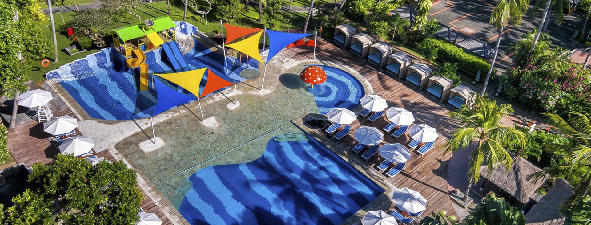 Hotel má 24-hodinovú recepciu, kaviareň, hlavnú reštauráciu Tirta s európskou a orientálnou kuchyňou, reštauráciu s indonézskou kuchyňou, reštauráciu s talianskou kuchyňou, snack bar/bar na pláži, obchody so suvenírmi, kozmetický a kadernícky salón a minimarket. V záhrade 2 bazény (1 sladkovodný) a detské brodítko so šmykľavkou (sladkovodné), slnečná terasa, slnečníky zdarma, ležadlá pri bazéne a plážové osušky. Hotel má veľké konferenčné centrum (najväčšia miestnosť pre viac ako 500 osôb) a kúpeľné centrum (podrobný cenník k dispozícii na recepcii). Pre najmenších je k dispozícii miniklub.