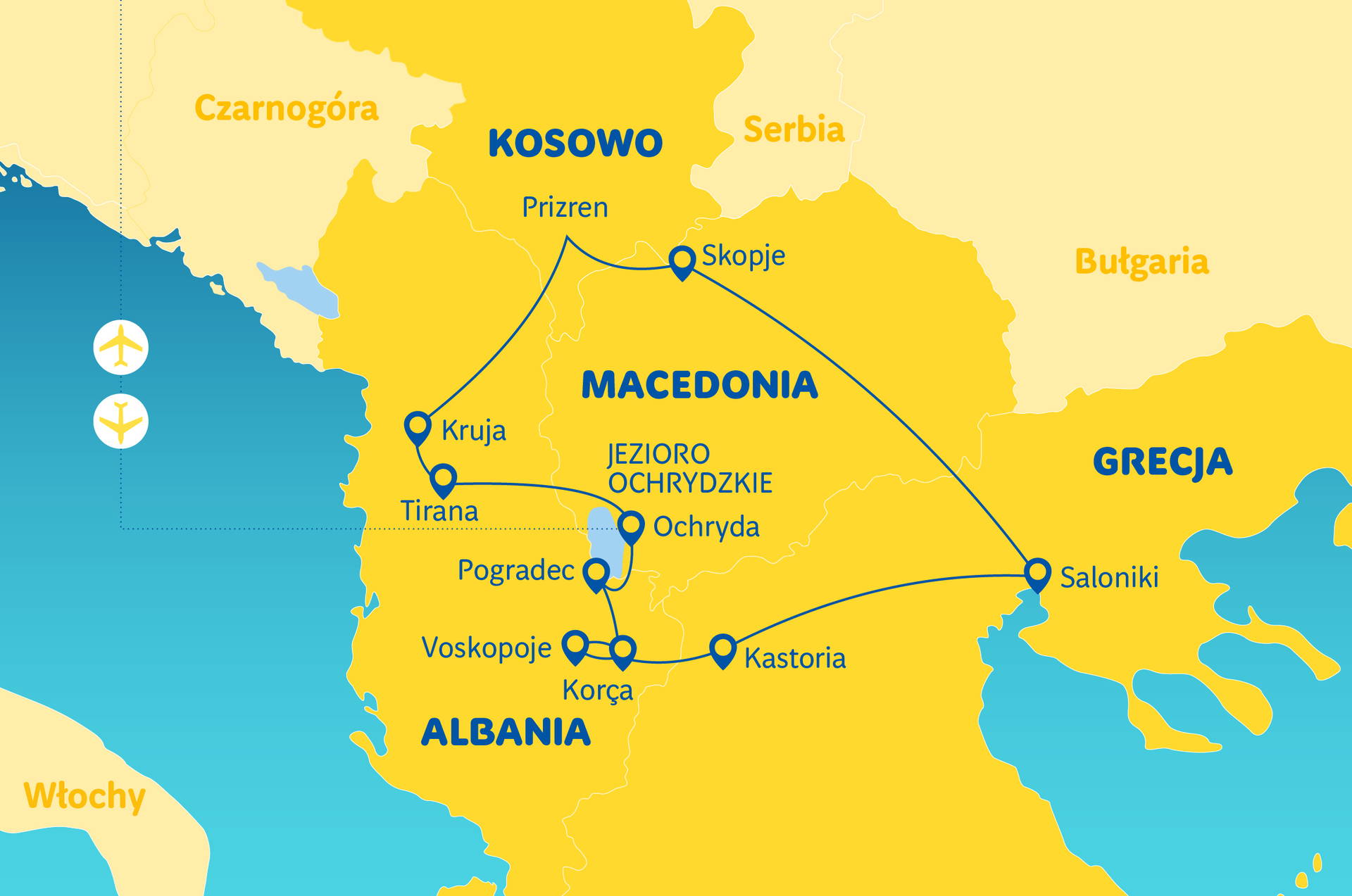 Korča - Paříž jihu • Soluň - řecké hlavní město módy - Skopje - hlavní město Makedonie a dům Matky Terezy • Kosovo a multikulturní Prizren • návštěva Albánie - Tirana a bunkry • Krujë - albánský Krakov • Ohrid a jeho perly (UNESCO) • odpočinek u křišťálově čistého Ohridského jezera