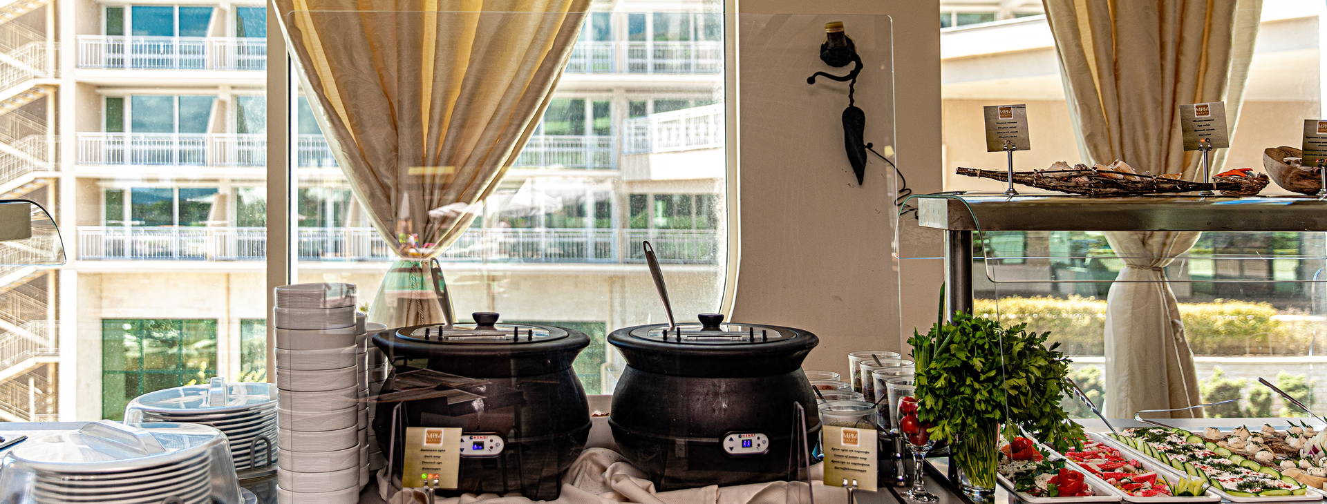 .All Inclusive. Welcome drink. Raňajky (7.30-10.00), obed (12.30-14.30) a večera (18.30-21.30) formou bufetu. Nealkoholické nápoje, voda, džúsy, čapované pivo, vybrané alkoholické nápoje k jedlám v cene. Nápoje a občerstvenie sa podávajú v lobby bare a bare pri bazéne (10.00-23.00). Nápoje v plážovom stánku (10.00-18.00). Na obed a večeru je povinný elegantný spoločenský odev.
