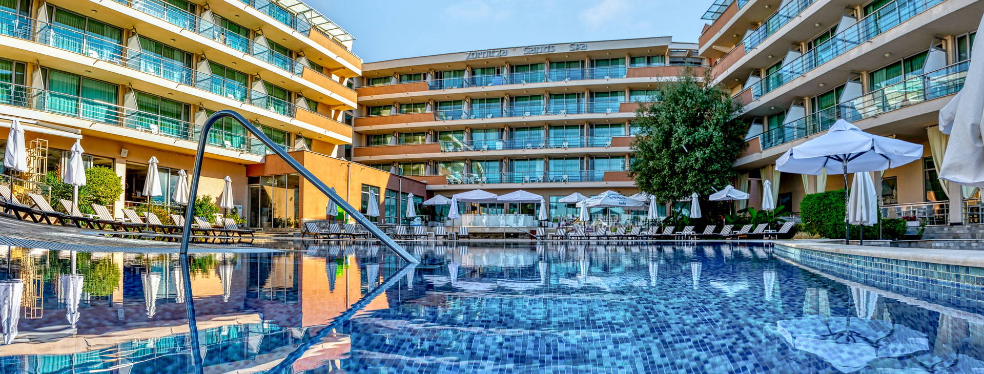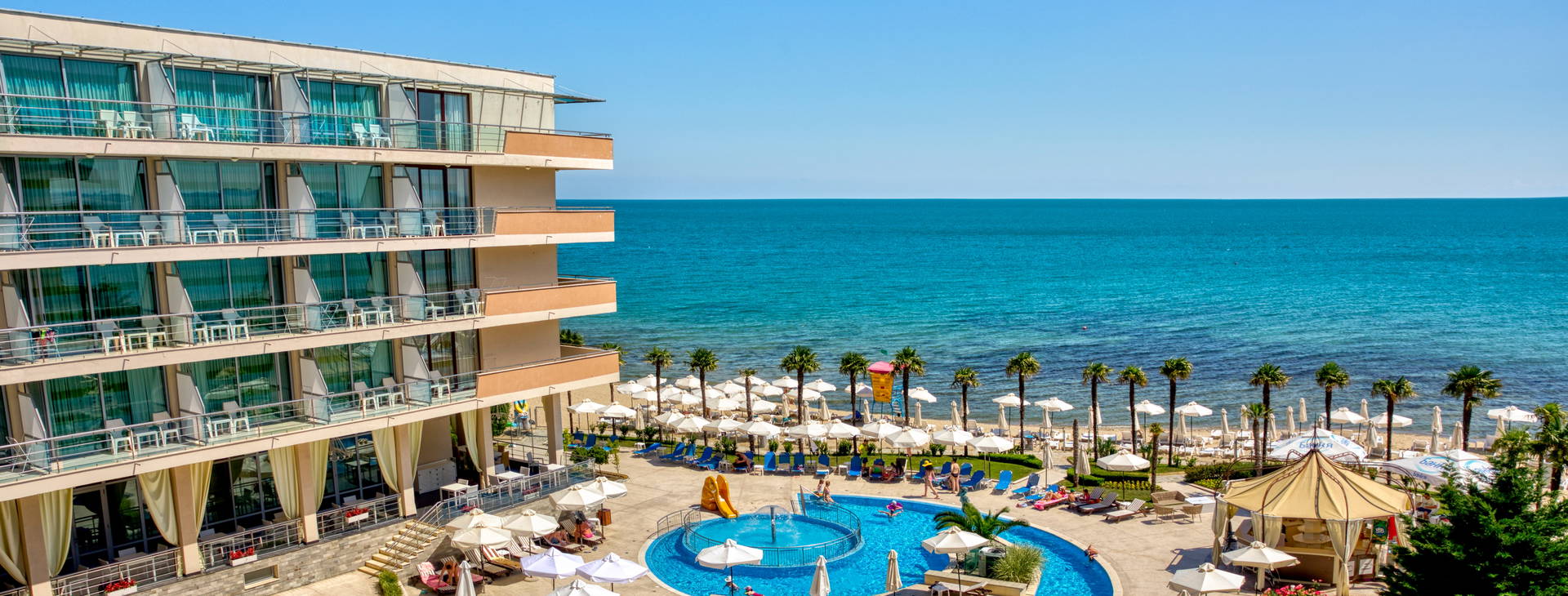 Hotel sa nachádza priamo na súkromnej pláži. Slnečníky a ležadlá sú k dispozícii zadarmo. Na jednu izbu je k dispozícii jeden slnečník a dve ležadlá.