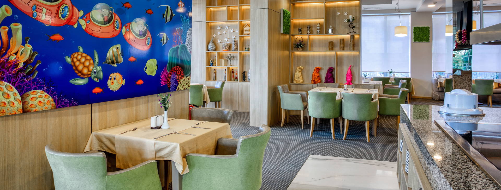 Hotel ponúka recepciu, hlavnú reštauráciu s terasou, reštauráciu a la carte a tri bary (lobby bar s terasou, bar pri bazéne a snack bar). V areáli hotela sa nachádzajú aj: dva vonkajšie bazény vrátane jedného s detskou časťou (slnečníky a ležadlá sú k dispozícii zdarma), sauna, parný kúpeľ, fitnes a relaxačná zóna, detský klub pre deti od 4 do 12 rokov a záhrada s detským ihriskom. Za príplatok môžu hostia využiť aj biliard, turecké kúpele alebo masážny a kozmetický salón. V hoteli sa nachádza aj konferenčná miestnosť na organizovanie obchodných podujatí.