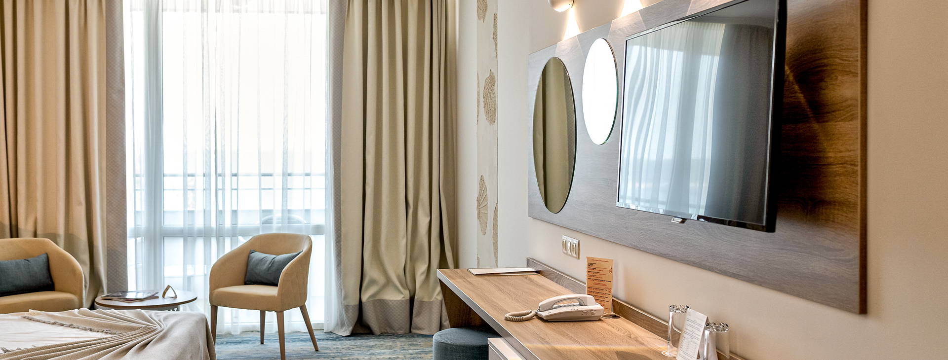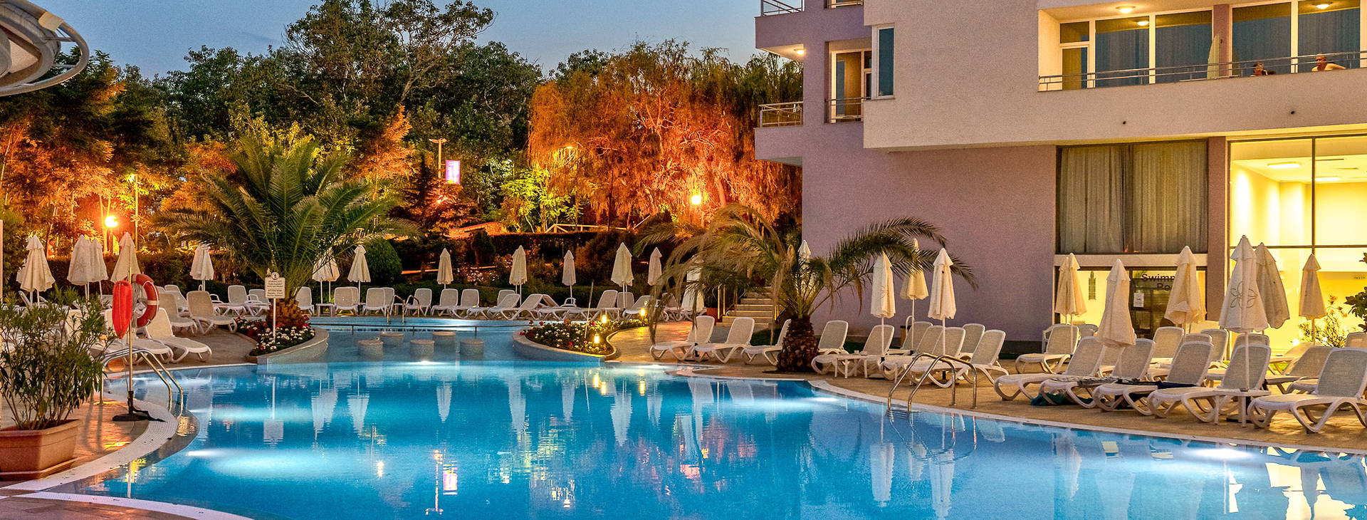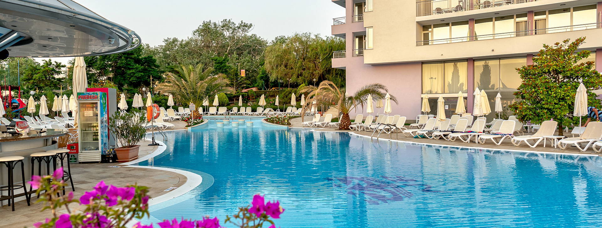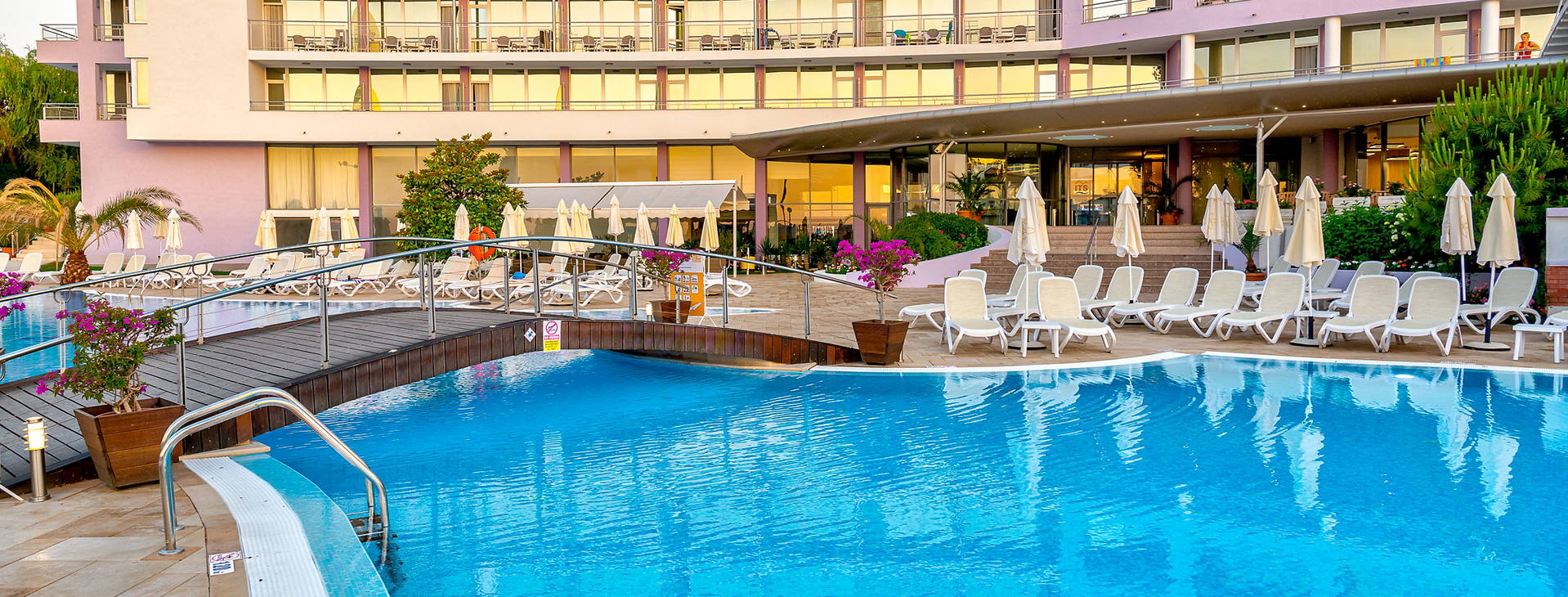 Hostia môžu v areáli využívať zmenáreň - vedľa recepcie, práčovňu (za poplatok), plážovú diskotéku, vonkajší bazén, krytý bazén a bazén pre deti (otvorený od 8:00 do 18:00), vonkajšiu vírivku a fitnes klub. Denná výmena uterákov, izbová služba a výmena posteľnej bielizne každé 3 dni. v areáli hotela hlavná reštaurácia, ktorá ponúka mimoriadny výber európskych špecialít spolu s tradičnou bulharskou kuchyňou (7:30-10:00, 12:30-14:30, 18:00-21:00), snack zóna (11:00-17:00), a'la carte reštaurácia (19:00-22:00) Vonkajší bar na terase reštaurácie (10:00-23:00), bar pri bazéne (9:00-00:00). Služby nezahrnuté v balíku all inclusive: alkoholické a nealkoholické nápoje a čerstvo vylisované šťavy miestnej výroby, telefón, izbová služba, práčovňa, trezor, minibar, masáže, kaderníctvo a kozmetický salón, zdravotné stredisko, ležadlá a slnečníky na pláži, biliard a elektronické hry, parkovisko.