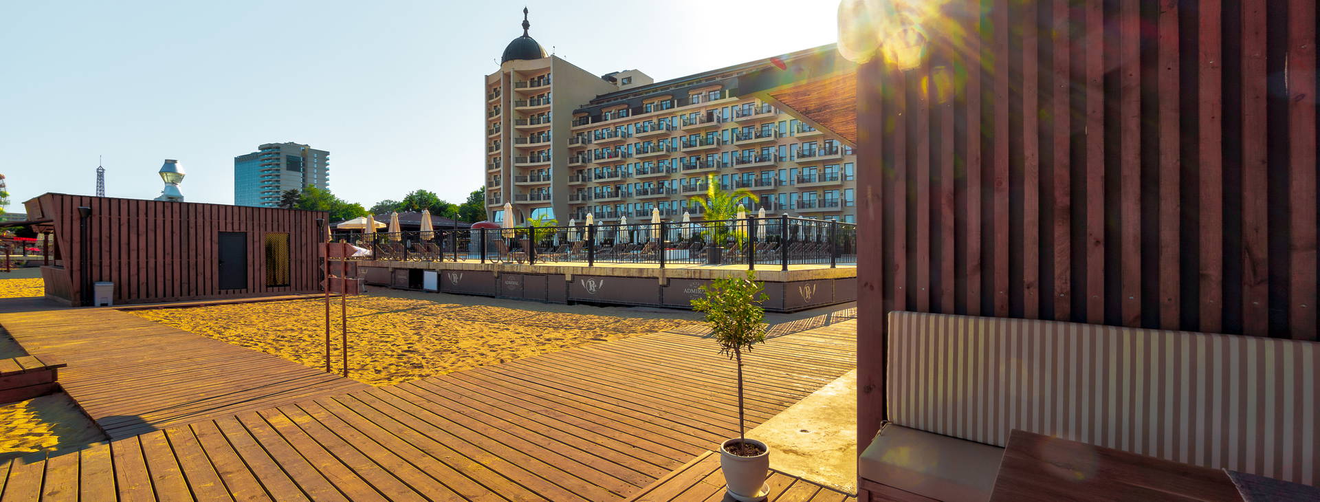 Luxusný hotel, ktorý bol na letnú sezónu 2023 rozsiahlo zrekonštruovaný, sa nachádza v samom centre známeho letoviska Zlaté piesky. Nachádza sa priamo pri piesočnatej, širokej pláži, ktorá je od hotela oddelená len promenádou, ktorá nabáda ku každodenným prechádzkam. Hotel sa nachádza v centre Zlatých pieskov, vedľa mnohých barov a reštaurácií a atraktívnych atrakcií živého letoviska. Na letisko vo Varne je to približne 25 km a na letisko v Burgase približne 135 km.