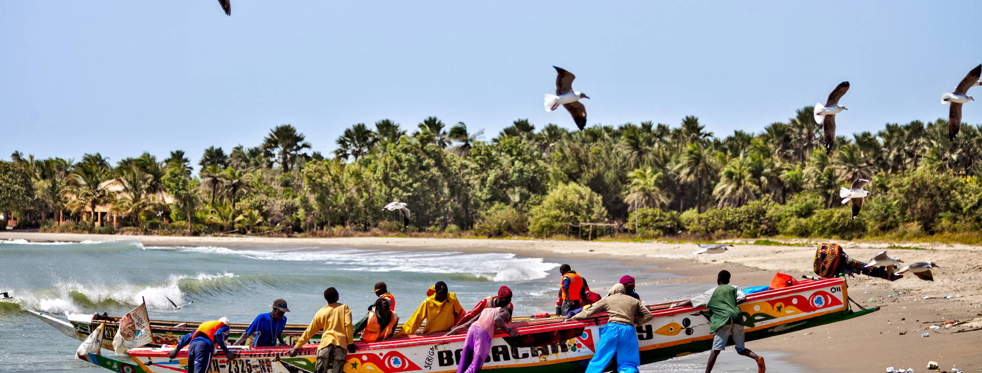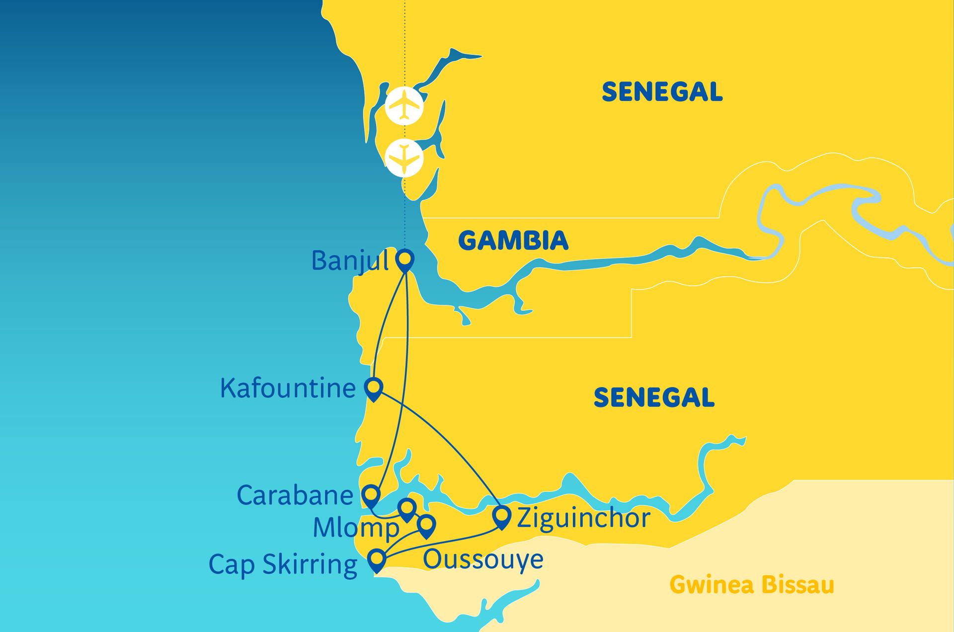 Po časné snídani se vydáme směrem k Giborroh, k hraničnímu přechodu s jižním Senegalem. Provincie Casamance nazývaná také „sýpkou Senegalu“ oplývá v okolí mnoha rýžovými poli, obřími baobaby, palmovými lesy, kapokovými stromy, mangovníky a ledvinovníky. Po pasové kontrole přejedeme přes Dioululu do města Kafountine, ležícího u břehu oceánu. Je zde největší rybí trh v provincii Casamance. Podíváme se na práci místních rybářů, budeme obdivovat jejich obrovské barevné pirogy. Každý den se odtud vydává cca 300 lodí na mořský rybolov. Dále se vydáme na jih, kde je krajina ještě zelenější. Cestou se zastavíme v Ziguinchoru, v hlavním městě provincie Casamance. Město je dnes obýváno především kmenem Diola. Dnes je důležitým místem pro export arašídů. Zdejší produkce řadí Senegal mezi největší světové výrobce. Přestávka na relaxaci v jedné z restaurací u řeky. Přejezd do pohádkového Cap Skirring, ubytování, večeře a přenocování v hotelu na pobřeží Atlantiku. (Trasa cca 280 km)
