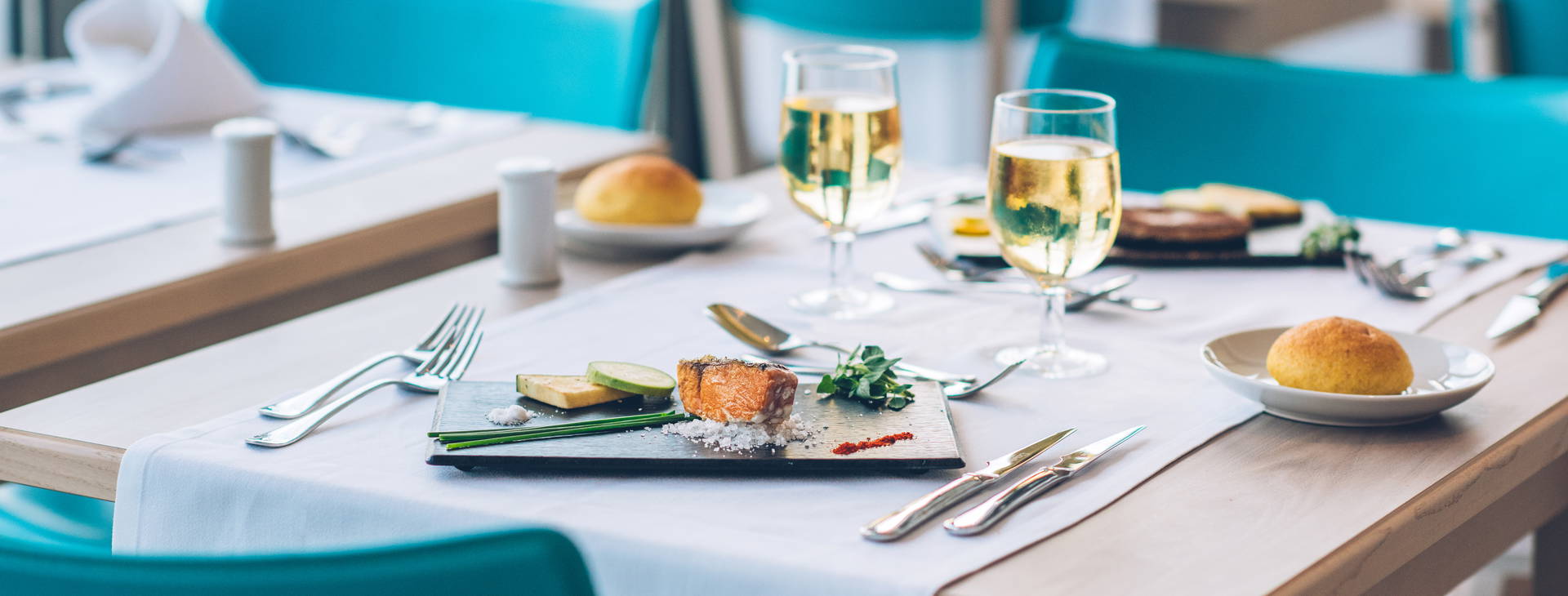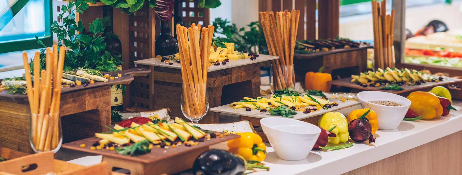 All Inclusive: raňajky (7:00-10:00), obed (12:00-14:00), večera (18:30-21:30) formou bufetu. Snack bar ponúka občerstvenie plus ukážky varenia a sladkosti (zmrzlina, palacinky, koláče) v určených časoch. Nealkoholické a alkoholické nápoje, káva a čaj sa podávajú vo vybraných hotelových baroch (10:00-22:00).
