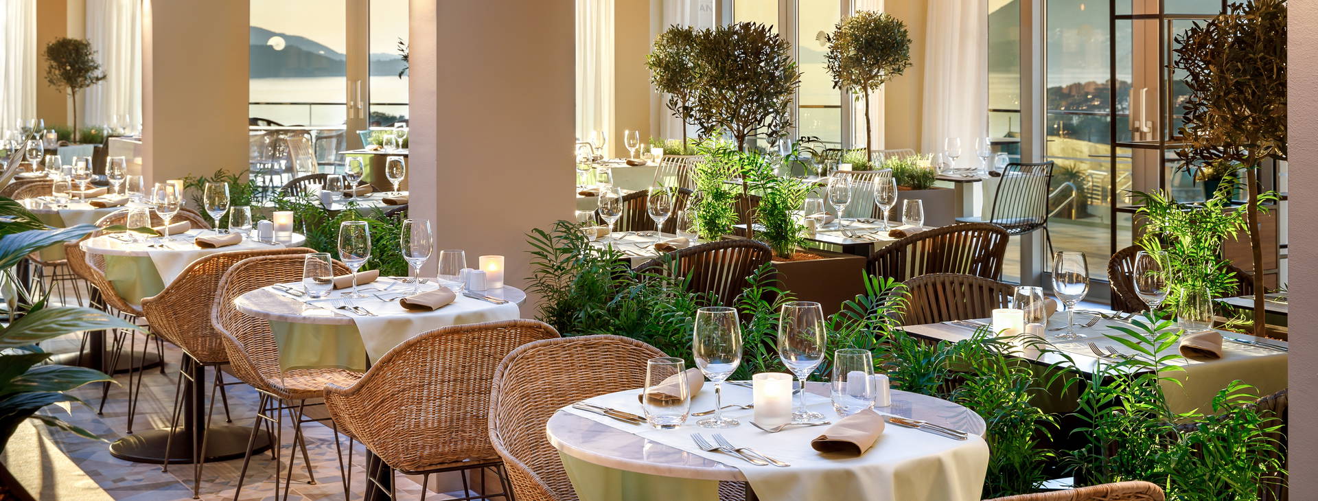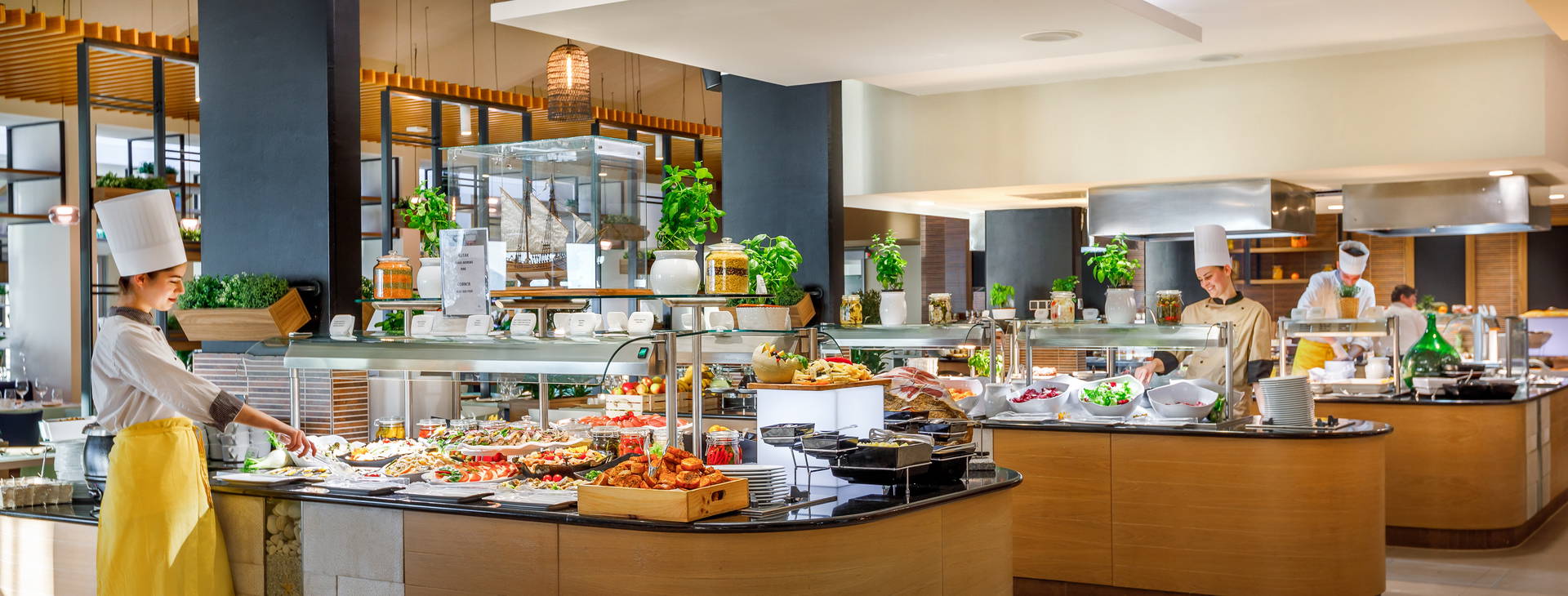 .Raňajky (7:00-10:00) a večere (19:00-21:30) sa podávajú formou bohatého bufetu v reštaurácii Meditarraneo. Podávajú sa v nej stredomorské, medzinárodné a chorvátske špeciality. Jedlá sa pripravujú priamo pred očami hostí. V rámci možnosti HB je možné vymeniť večeru v hlavnej reštaurácii za večeru a'la carte v reštaurácii Momenti. Želanie o výmenu je potrebné nahlásiť na recepcii do 14:00.