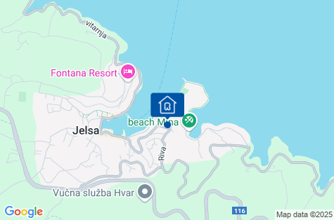 Objekt sa nachádza 700 m od centra malebného mesta Jelsa na ostrove Hvar. Samotný ostrov Hvar sa spája s vinicami, levanduľovými poliami (zber sa koná koncom júna a začiatkom júla) a predovšetkým so slnkom, ktoré tu svieti v priemere viac ako 300 dní v roku. Jelsa sa nachádza v severnej časti ostrova a je obklopená horami, borovicovými lesmi, vinicami a olivovými hájmi. V centre mesta nájdete množstvo obchodov, miestnych barov a konob. Vzdialenosť k najbližšiemu obchodu je cca 150 m, autobusová zastávka je vzdialená cca 900 m, prístav cca 1,5 km od hotela. Transfer z letiska Zadar do hotela trvá približne 4 hodiny, transfer z letiska Dubrovník do hotela trvá približne 4,5 hodiny (dĺžka transferov sa môže meniť, pretože závisí od trajektových spojení).