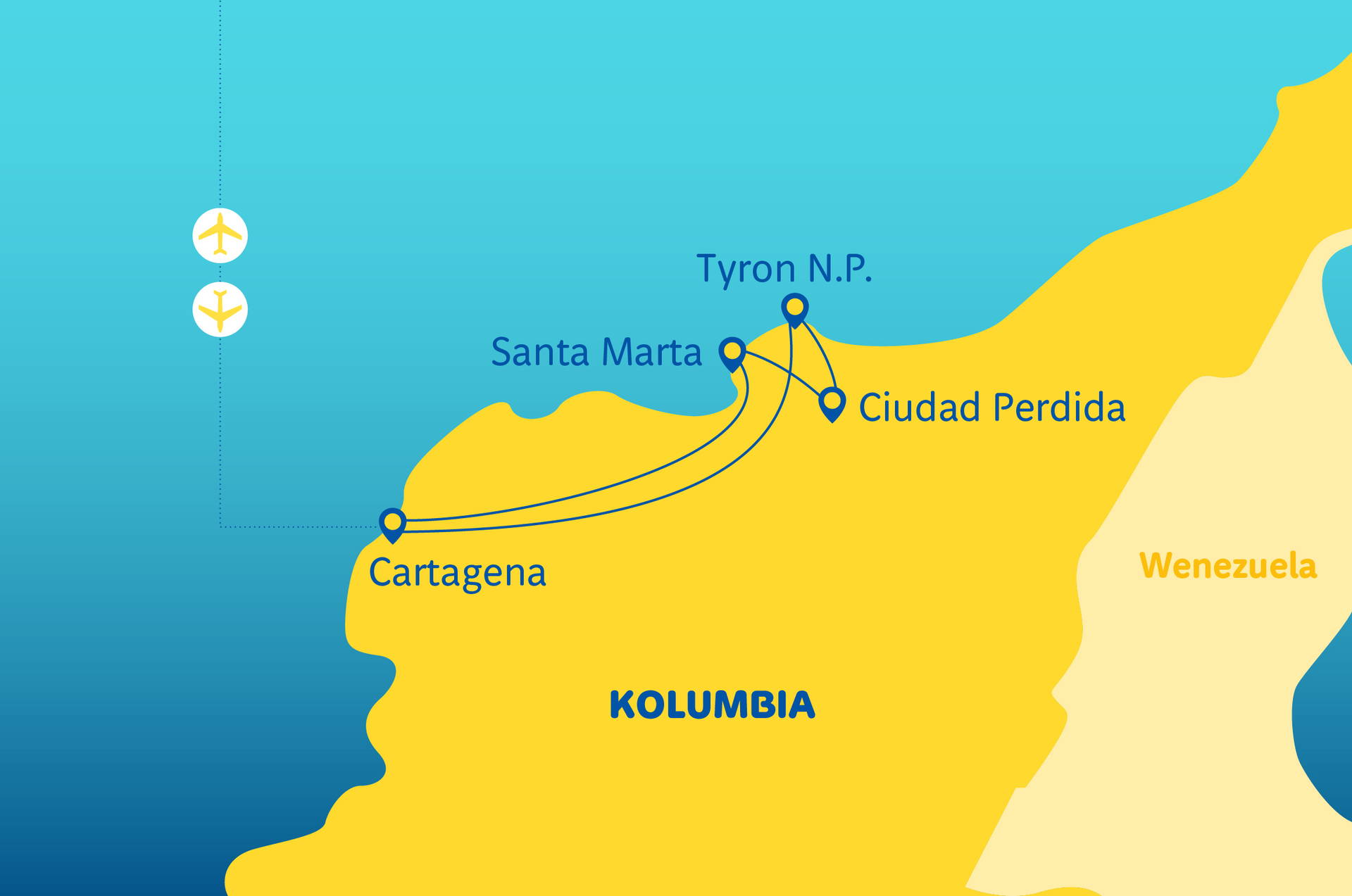 Ranní snídaně a poté džípy dorazíme na výchozí místo našeho dobrodružství. Čeká nás trasa dlouhá asi 60 km, kterou musíme projít pěšky mezi horami Sierra Nevada de Santa Marta. V doprovodu místního průvodce se vydáme na túru. Cestou budeme naslouchat přírodě, poznávat kulturu indiánů z Tayrony a objevovat tajemství a zajímavosti tohoto regionu. Mimo jiné zjistíme, k čemu indiáni Kogua používají speciální kalabasu. Naším cílem je ztracené město Ciudad Perdida, kolumbijské Machu Picchu. Každý den budeme mít na procházku přibližně 5 až 7 hodin v závislosti na počasí a schopnostech účastníků. Nocovat budeme v houpací síti nebo na palandě v závislosti na tábořišti. Oběd a večeře v ceně.