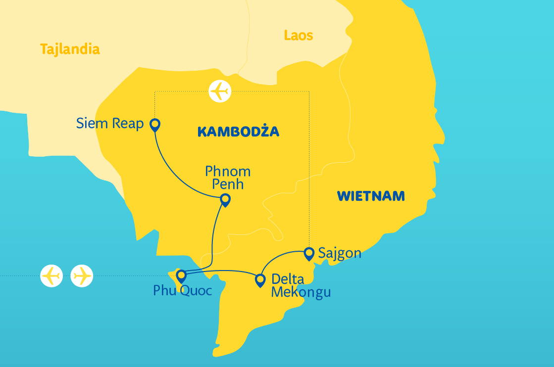 Základní cena zahrnuje: přelet charterovým letadlem společnosti LOT typu Dreamliner na ostrov Phu Quoc (přímý let), přelet místními leteckými linkami na trase: Phu Quoc - Siem Reap, letištní taxy, ubytování v hotelech (7 nebo 14 nocí), transfery klimatizovaným autokarem/minibusem a trajektem, stravování dle programu, služby polského zástupce během odbavení na letišti v Polsku, služby polského průvodce během prohlídek, turistický program (viz níže), pojištění TU Europa varianta základní (úrazové pojištění a léčebné výlohy, trvalé následky, asistenční služby a pojištění zavazadel).