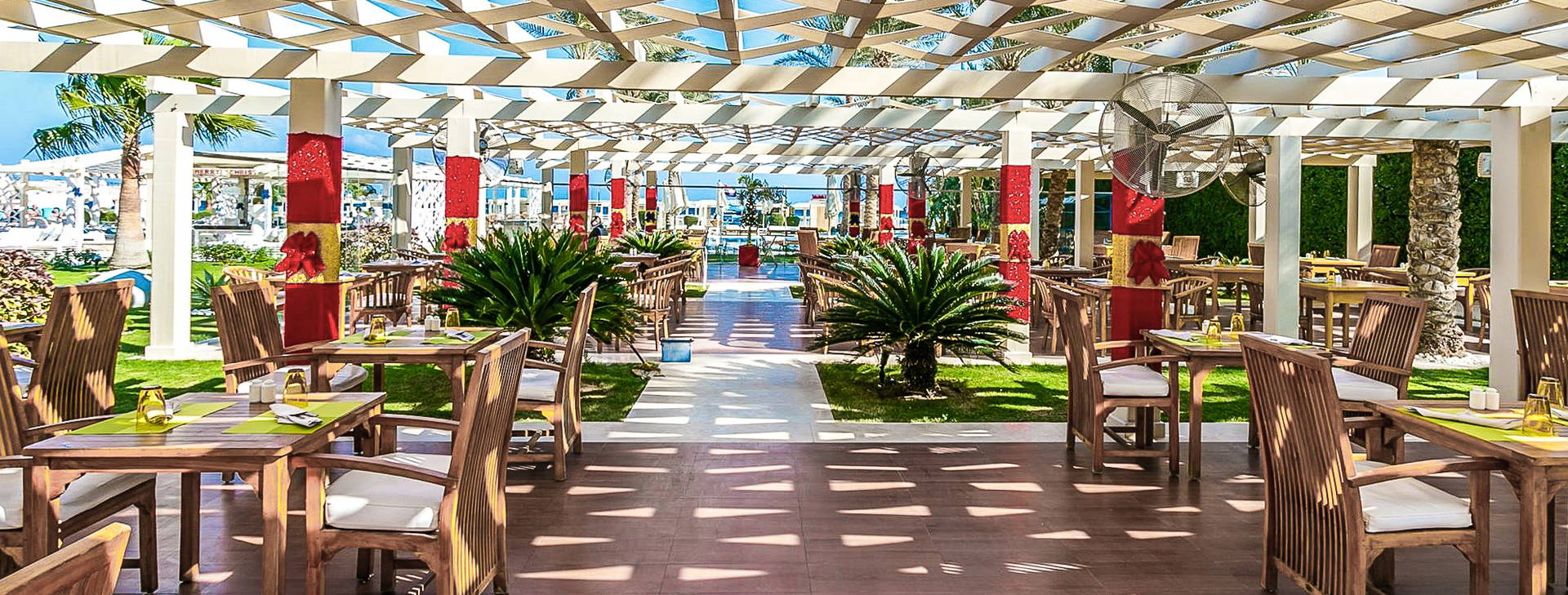 .Ultra All Inclusive: raňajky (07.00-11.00), obed (12.30-15.00), večera (19.00-21.30), neskorá večera (23.30-01.00) - formou bufetu v hlavnej reštaurácii, ľahké občerstvenie počas dňa v baroch a na pláži, niektoré dovážané alkoholické, miestne alkoholické (rum, brandy, gin, whisky, vína) a nealkoholické nápoje, čaj, káva, pivo, džúsy podávané v určených baroch (lobby bar - 24 hodín denne; plážový bar - 10.00-17.00). Počas pobytu 1-krát možnosť večere v reštaurácii Bella alebo Mandarin (nápoje sa platia extra, nutná rezervácia vopred).
