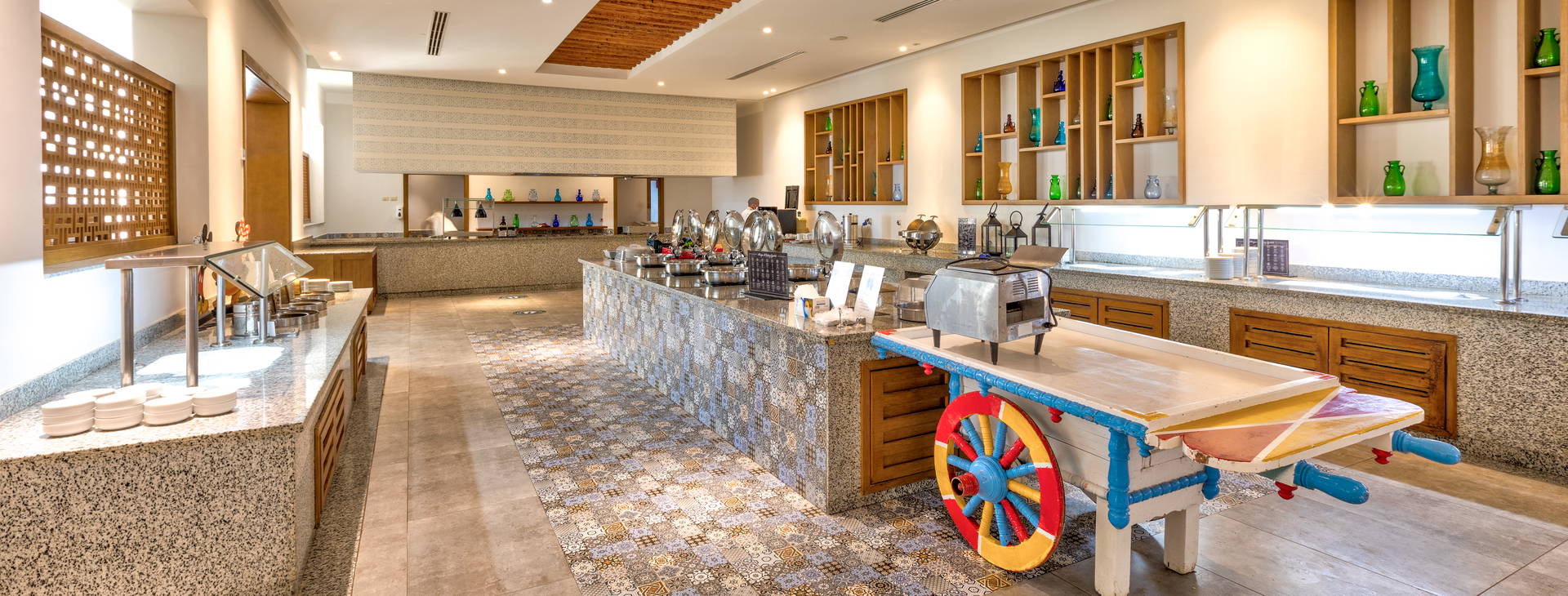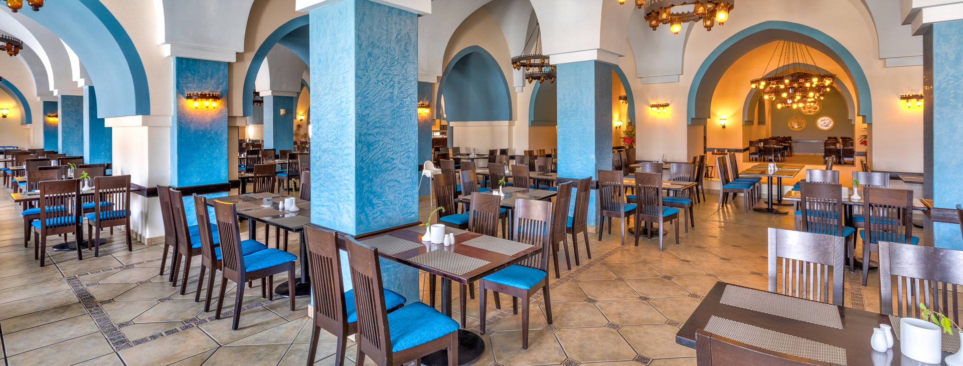 All inclusive: raňajky (6:30-10:00), obed (12:30-14:30), večera (18:30-21:30) formou bufetu v hlavnej reštaurácii. Neskoré raňajky podávané v bare pri bazéne a na pláži (10:30-11:30). V reštaurácii Sea Horse A la Carte (za poplatok, rezervácia nutná): obed (12:00-17:00) a večera (18:30-21:30). Miestne alkoholické a nealkoholické nápoje vo vybraných baroch. Plážový a bazénový bar otvorený 09:00 - 18:00, v lobby (12:00-24:00) na streche (17:00-24:00). Plus zmrzlina a popoludňajšie občerstvenie v bare pri bazéne a na pláži. Okrem toho môžu zákazníci využiť taliansku, ázijskú a blízkovýchodnú tematickú reštauráciu v hoteli Medinat Coraya (za poplatok; nutná rezervácia vopred). Na izbu sa denne dodáva fľaša vody. Pri večeri sa vyžaduje vhodné oblečenie (dlhé nohavice pre pánov). Nápoje vo fľašiach, čerstvo vylisované šťavy, dovážané alkoholické nápoje - za príplatok. Hotel si vyhradzuje právo na zmenu rozsahu služieb zahrnutých vo vzorci all inclusive (napr. časy podávania).