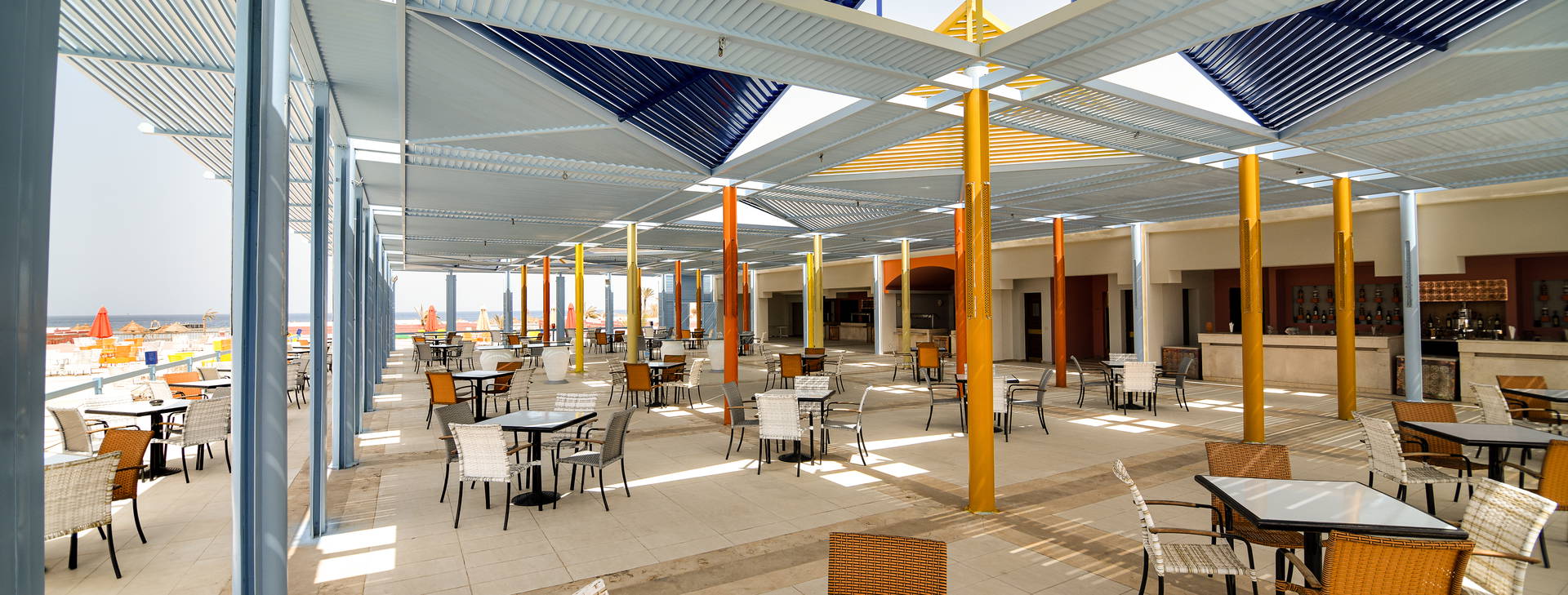 All Inclusive zahŕňa: raňajky (07:00-10:00), neskoré raňajky (10:00-11:00), obedy (12:30-14:30), večere (19:00-21:00) a neskoré večere (22:00-23:00) formou bufetu v hlavnej reštaurácii "Alexander". Po predchádzajúcej rezervácii možnosť večere v talianskej a la carte reštaurácii "Poseidon" (18:30-21:30). K dispozícii tiež: občerstvenie (12:30-16:00) v reštaurácii "The Grill Restaurant", "The Time" (17:00-18:00) a zmrzlina (18:30-21:00) v hlavnej reštaurácii. Miestne alkoholické a nealkoholické nápoje sú k dispozícii v: bare pri bazéne "Scruba bar" (09:00-22:00), bare pri bazéne "Sailors bar" (10:00 do západu slnka a 20:00-00:00), bare na pláži "Pirates bar" (10:00 do západu slnka) a "Waves" (diskotéka) (22:00-02:00 - po 00:00 nápoje za príplatok). All inclusive nezahŕňa čerstvo vylisované šťavy a dovážané alkoholické nápoje.