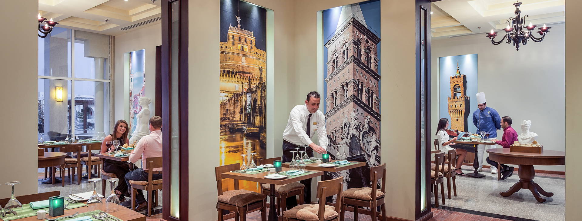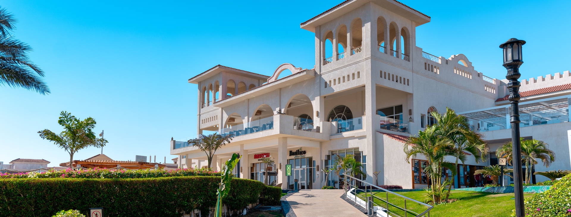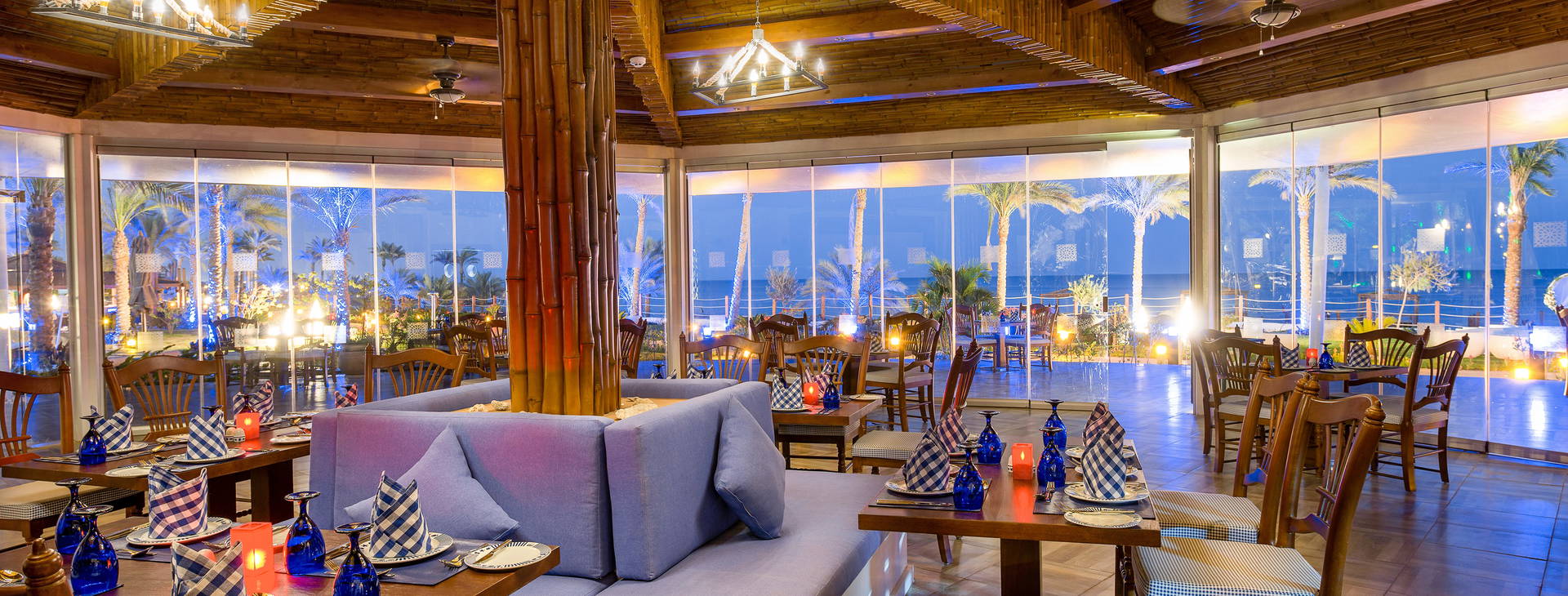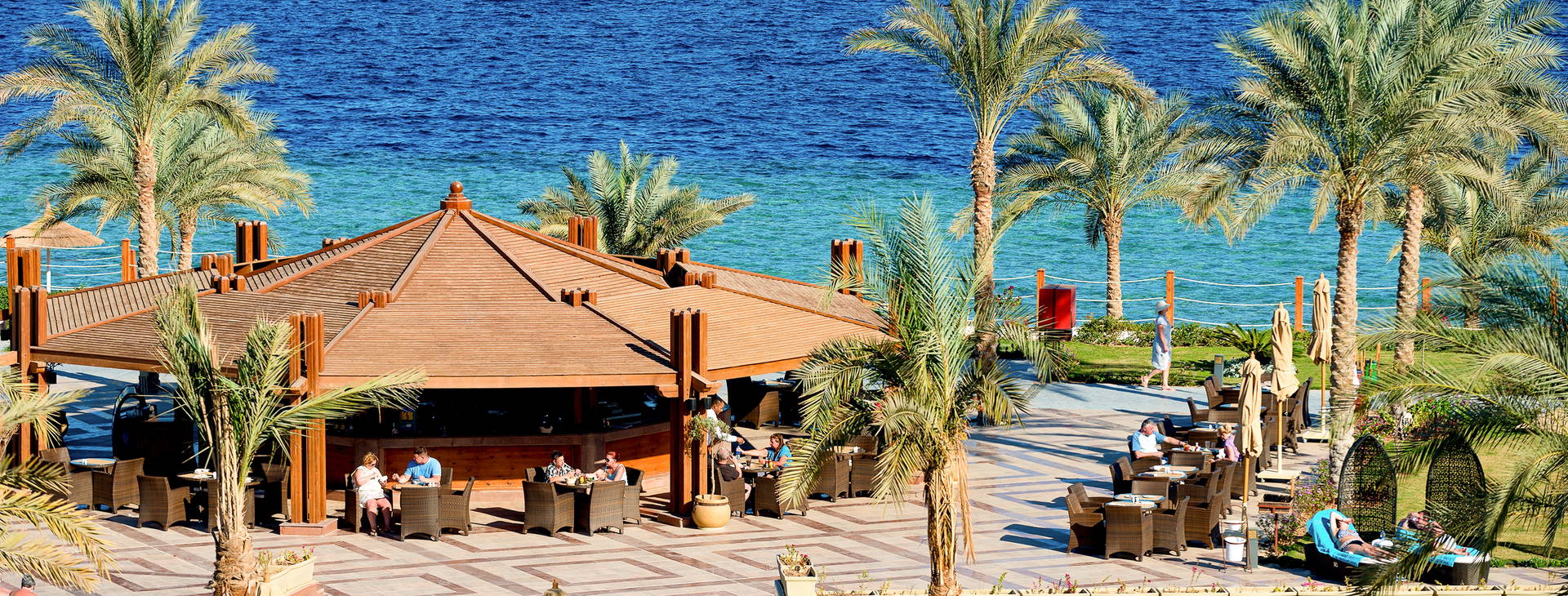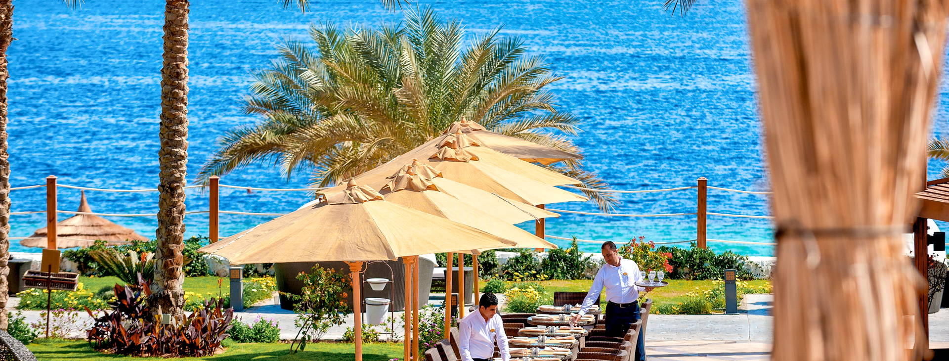 All inclusive: raňajky formou bufetu (7.00-10.30), obed formou bufetu (12.30-14.30), večera formou bufetu (18.30-22.00) v reštaurácii Horizon (medzinárodná kuchyňa). Hostia môžu po predchádzajúcej rezervácii využiť aj reštauráciu a la carte (talianska kuchyňa, ázijská kuchyňa, egyptská kuchyňa, diétna kuchyňa, steak house) v čase 18.30 - 22.00 hod. Gril reštaurácia otvorená od 19.00 do 22.30 hod. Ďalšia platená a la carte reštaurácia Felucca s jedlami z rýb a morských plodov a sushi v ázijskej reštaurácii. Občerstvenie sa podáva v bare v aquaparku a v bare pri bazéne od 12.00 do 17.00 hod. Polnočné občerstvenie (23.00 - 01.00) v lobby bare. (Vybrané nealkoholické a alkoholické nápoje sa podávajú v baroch v areáli hotela. Ostatné bary sú otvorené od 10.00 do 17.00 /18.00 hod. Splash bar pri bazéne otvorený tiež od 18.30 do 22.00 hod. Hotel si vyhradzuje právo na zmenu rozsahu služieb zahrnutých vo vzorci all inclusive (napr. časy podávania jedál).