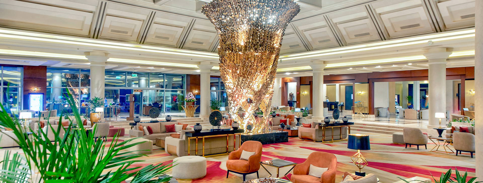 .Ultra all inclusive: raňajky (07.00 - 10.00), neskoré raňajky (10.00 - 11.00), obed (12.30 - 14.30), večera (18.30 - 21.30), neskorá večera (23.00 - 02.00) v hlavnej reštaurácii The Palm formou bufetu, občerstvenie a la carte v baroch Lagoon a Oasis pri bazénoch od 11.00 - 17.00, koláče v Cafe de Nuit od 12.00.V prípade à la carte reštaurácií (v cene, rezervácia a vhodné oblečenie nutné): raňajky (07.00 - 10.00) a večere (18.30 - 22.00) v tureckej reštaurácii Lalezar s nádherným výhľadom na more, Executive Lounge s medzinárodnou kuchyňou (08.00 - 24.00), večere (18.30 - 22.00) v reštauráciách: V reštauráciách: Sakura (japonská kuchyňa), Salt (jedlá z morských plodov), Taj Mahal (indická kuchyňa), Gusto (talianska kuchyňa), Asian (kuchyňa Ďalekého východu), La Churrascaria (brazílska kuchyňa), The Mangal (grilované jedlá). Miestne a dovážané alkoholické a nealkoholické nápoje sa podávajú v baroch v areáli hotela v určených časoch. Piano bar je otvorený 24 hodín denne. Všetky nápoje sa v baroch a reštauráciách podávajú v sklenených nádobách.