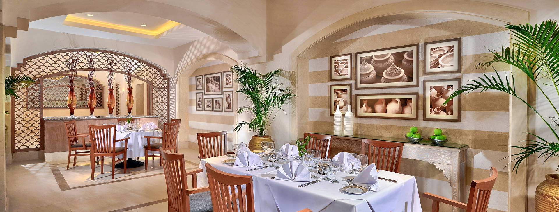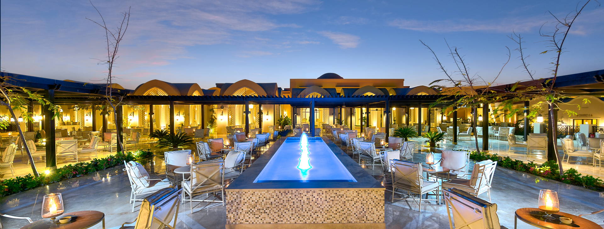 .All inclusive: raňajky (07.00 - 10.30), obed (12.30 - 15.00), večera (18.30 - 22.00) v hlavnej reštaurácii Rihanna formou bufetu, neskoré raňajky (10.30 - 11.00), neskoré raňajky (10.30 - 12.00), večera (12.30 - 13.00) v hlavnej reštaurácii Rihanna.30) a občerstvenie (12.00 - 17.30) v snack bare Almaza, občerstvenie (12.00 - 17.00) v baroch Amoura a Sanafir, koláče (18.00 - 22.00) v bare Cazar, neskorá večera (24.00 - 02.00) v bare Marha. Hostia môžu využiť aj služby a la carte reštaurácií (3-krát počas týždenného pobytu, rezervácia nutná, 18.30 - 22.30):