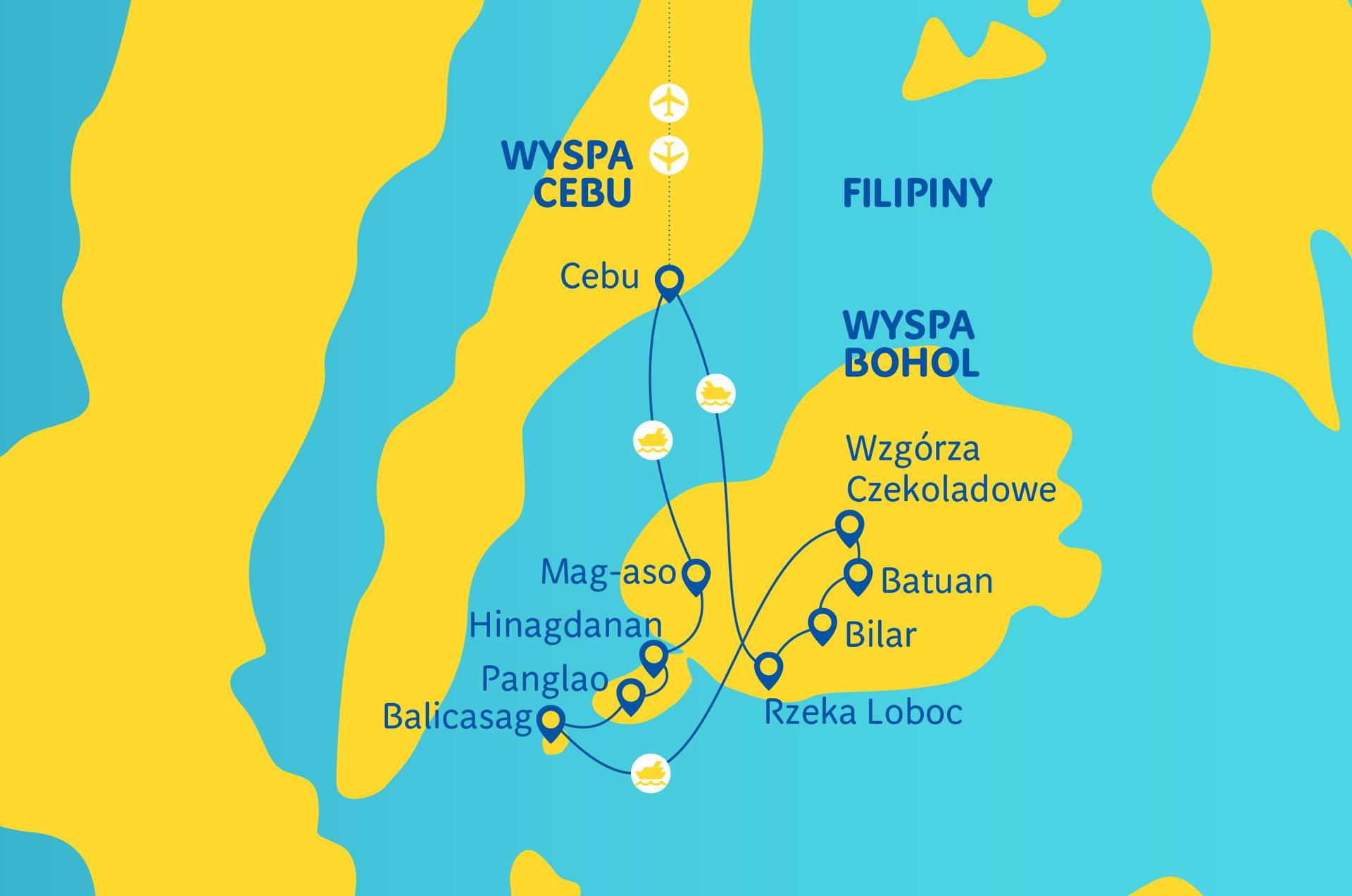Cena zahrnuje:Let pravidelnou linkou Varšava-Cebu-Varšava s přestupem (možnost technického mezipřistání v Clarku), transfery letiště-hotel-letiště (včetně trajektu Bohol-Cebu-Bohol), 11 započatých nocí v hotelu (včetně první noci v hotelu na Cebu), stravování dle programu, péče polského pilota a místních průvodců, turistický program dle výše uvedeného.