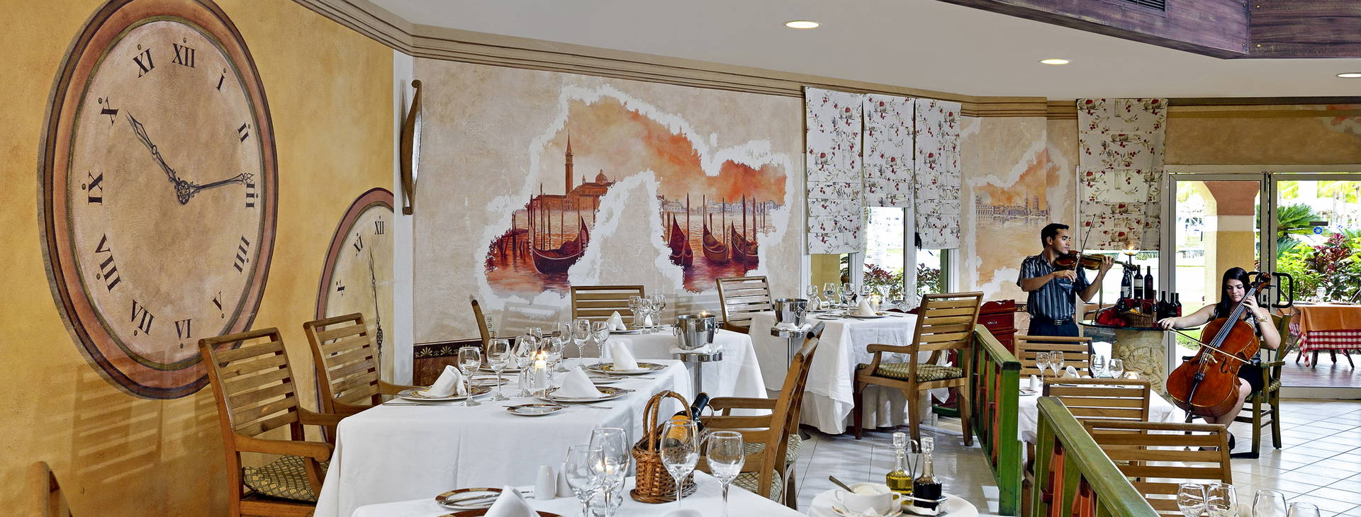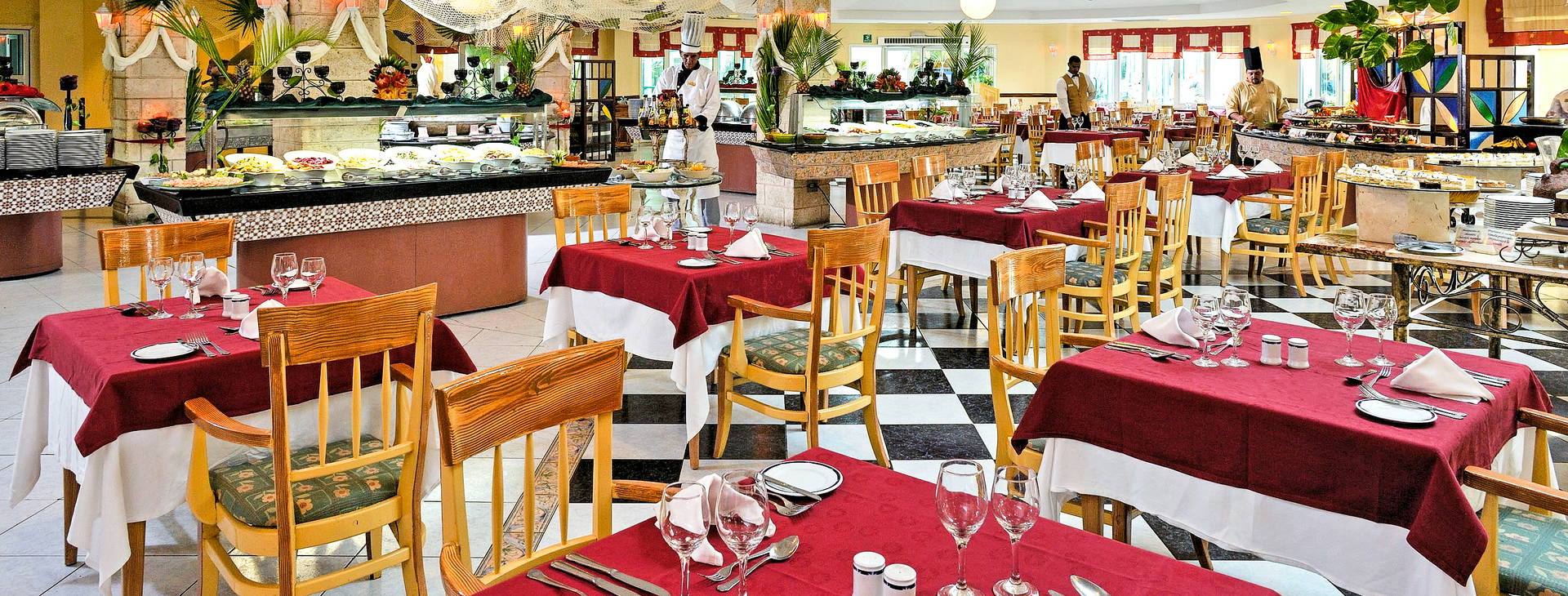 All Inclusive: raňajky (07:30-10:00), obed (12:30-14:30) a večere (18:30-22:00) - sú podávané formou bufetu v hlavnej reštaurácii, tri reštaurácie a'la carte (nutná včasná rezervácia): talianska, gurmánska a jedlá z darov mora, ľahké občerstvenie v baroch, miestne alkoholické a nealkoholické nápoje počas celého dňa v miestach vyznačených hotelom.