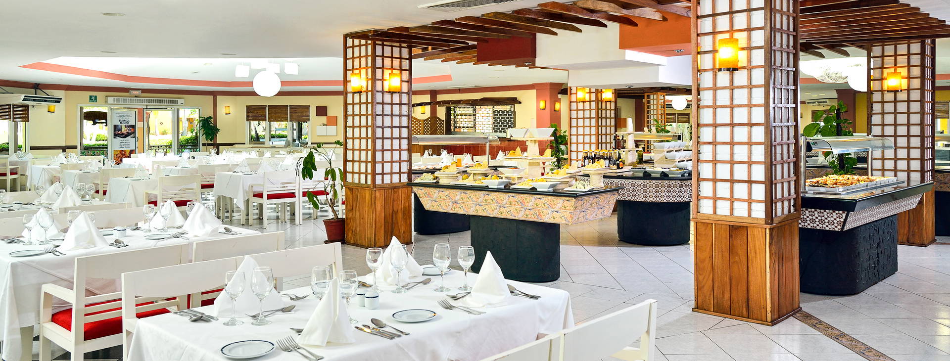 .All Inclusive: raňajky (07:30-10:00), obedy (12:30-14:30) a večere (18:30-22:00) formou bufetu podávané v hlavnej reštaurácii, 3 a'la carte reštaurácie (nutná rezervácia vopred): talianska, gurmánska a morské plody, občerstvenie v baroch, miestne alkoholické a nealkoholické nápoje podávané 24 hodín denne vo vyhradených priestoroch hotela.
