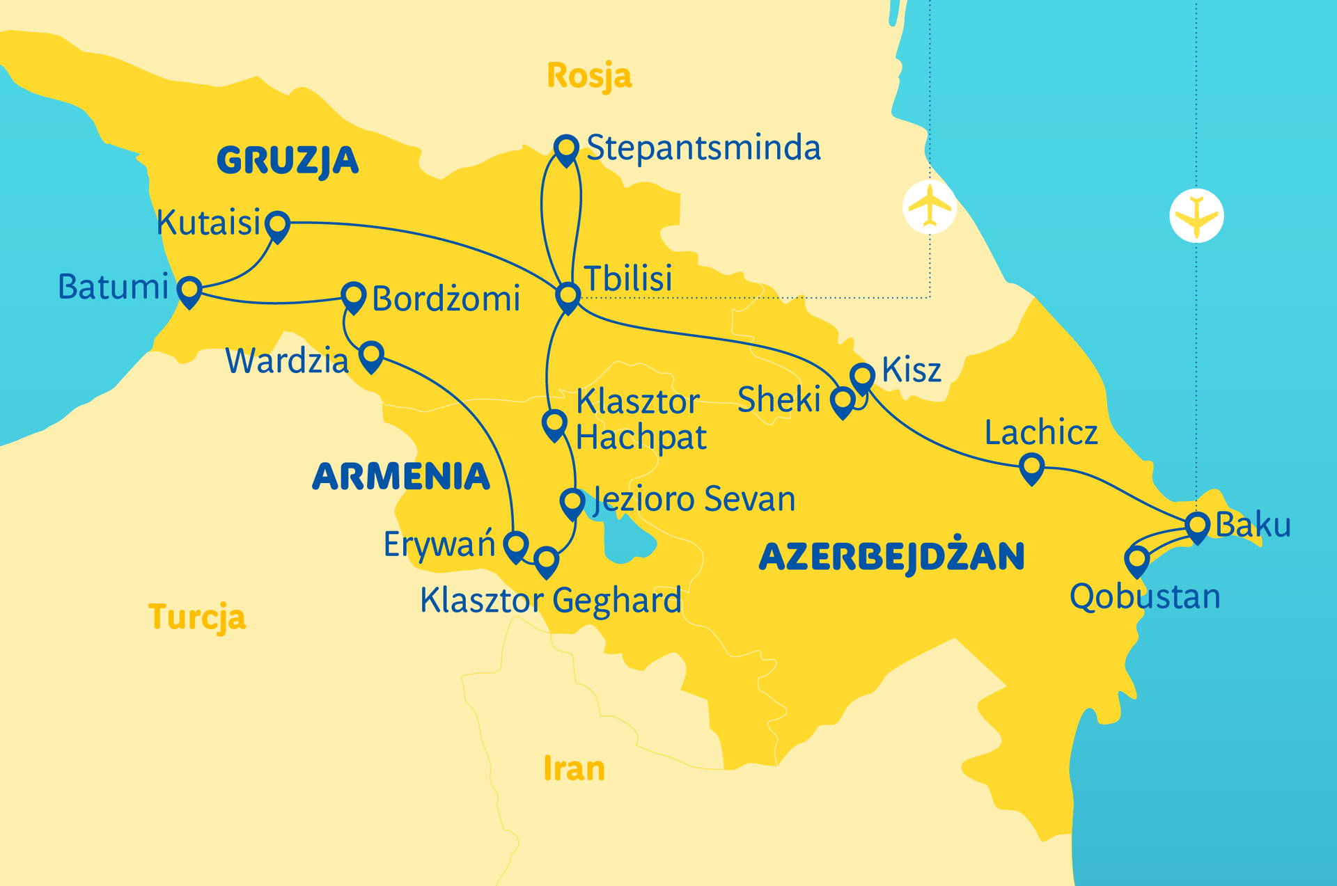 Baku – město ropy • Qobustan s bahenními sopkami • Lahic – městečko řemesel • Tbilisi – kulturní tavicí kotel • Černý klášter • Jezero Sevan – smaragd Arménie • Klášter Haghpat • Továrna na brandy v Jerevanu • Ečmiadzin – arménský „Vatikán“ • Vardzia – klášter vytesaný ve skále • Borjomi – „alpské lázeňské město“ • Batumi – černomořské letovisko • Gori – Stalinův rodný dům