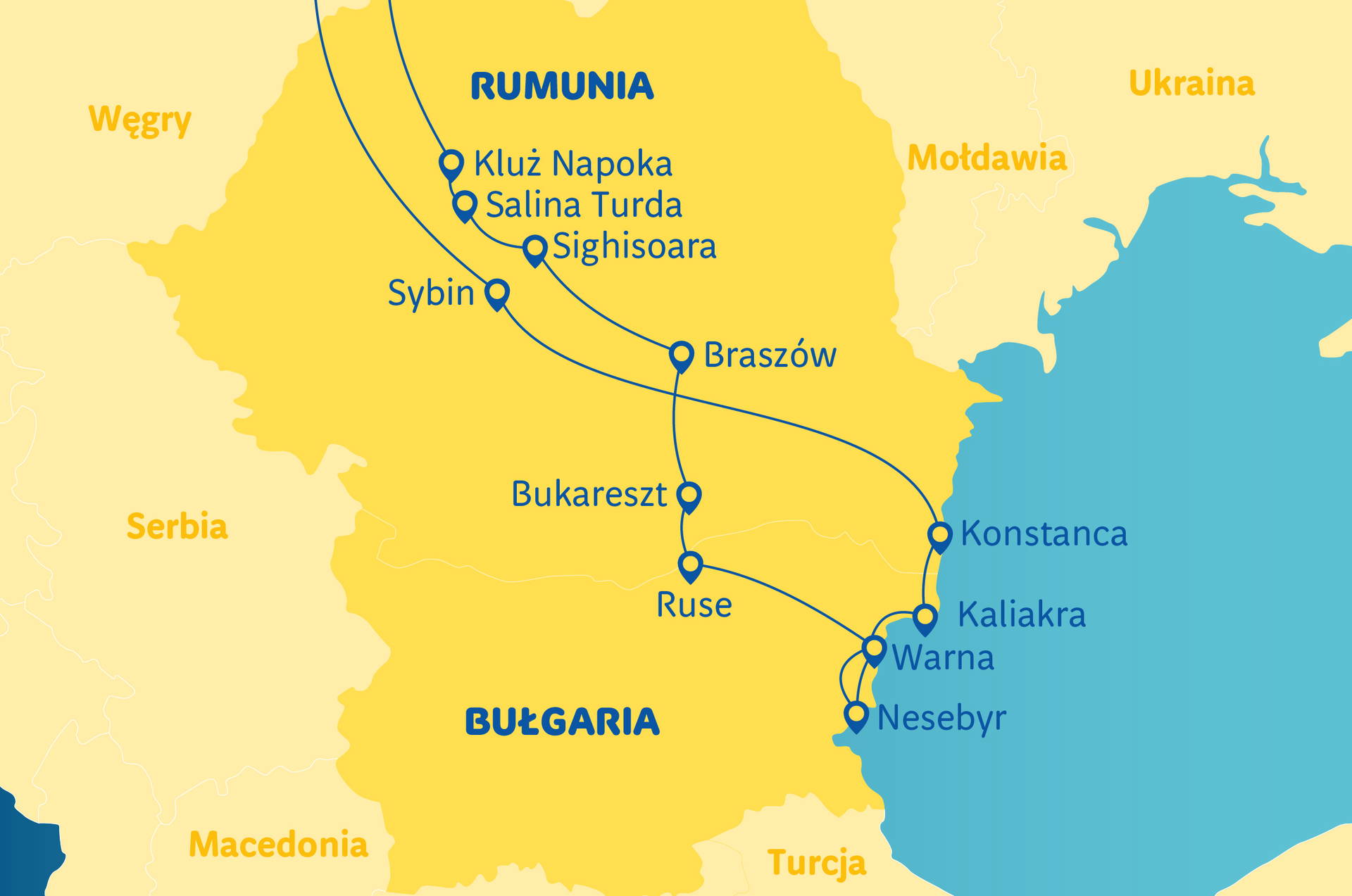Kluž - hlavní město Transylvánie • Bran - „hrad hraběte Drákuly“ • Bukurešť - Paříž Balkánu • Segešvár (Sighisoara) - místo narození Drákuly • Brašov - „Transylvánie v kostce“ • Sibiu - město umělců • Ruse - město „ducha svobody“ • Nesebar - „perla Černého moře“ • Constanta - hlavní město Dobrudži • mys Kaliakra - bulharské útesy • pobyt v Bulharsku u Černého moře