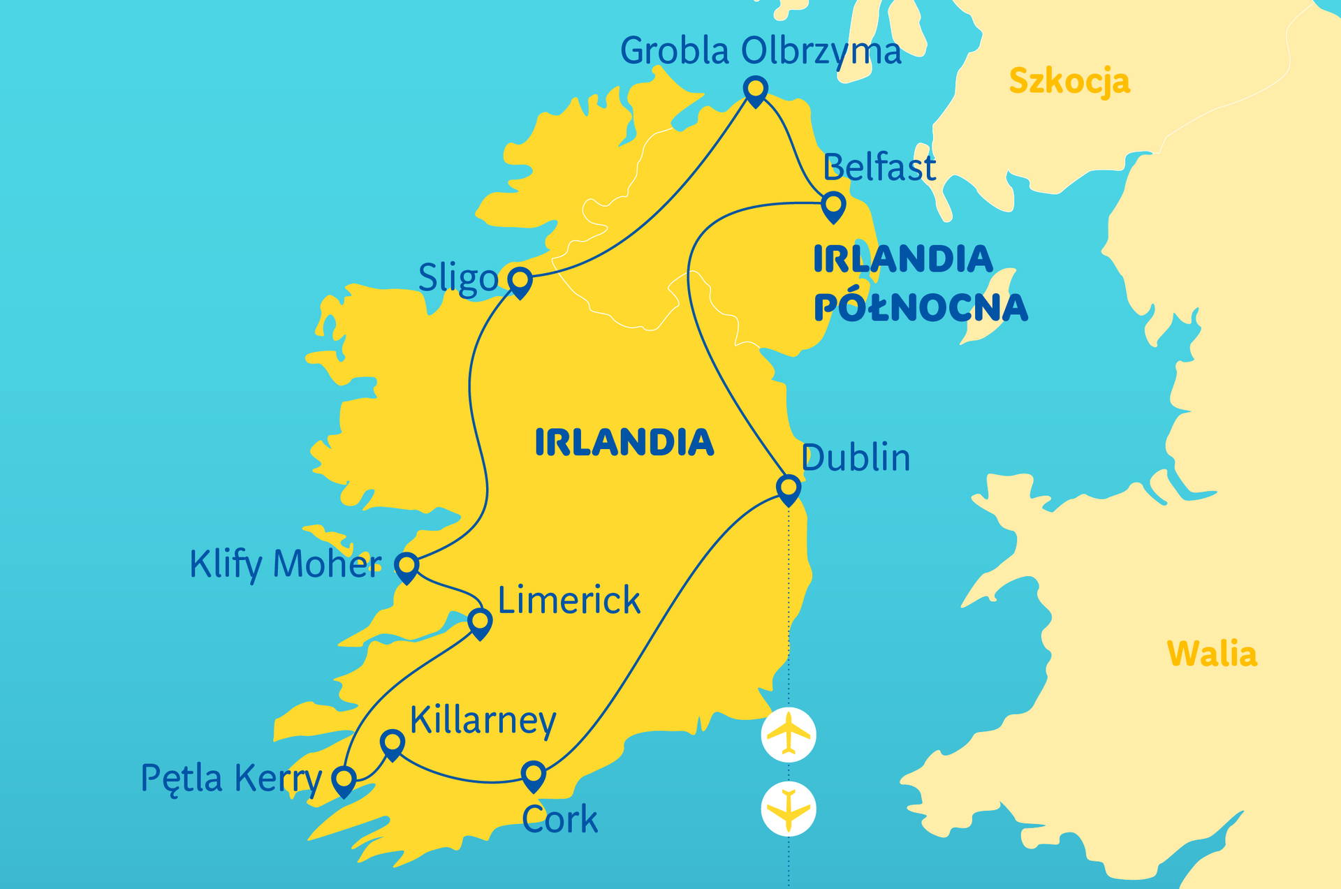 Dvě hlavní města - Dublin a Belfast • síla přírody - obří hráz a útesy Moher • irské fjordy • Kerry Loop - nejznámější vyhlídková trasa • hrad Bunratty a Vikingové • nejmalebnější vesnice Irska Adare • Cork - přístavní město na řece Lee