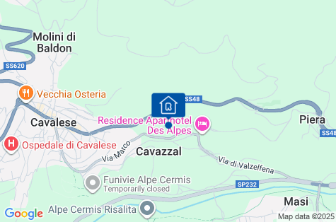 Hotel sa nachádza asi 500 m od centra Cavalese a asi 800 m od lyžiarskych vlekov Alpe Cermis (asi 23 km zjazdoviek), ktorých vrcholom je dlhá zjazdovka na olympijskom svahu - 7,2 km. Z hotela je nádherný výhľad na Pale di San Martino a vrch Lagorai. Stanica Latemar (približne 50 km zjazdoviek) je od hotela vzdialená približne 14 km. V blízkosti hotela sa nachádza zastávka miestneho skibusu (cca 6 EUR/týždeň). V centre Cavalese sa nachádza široká ponuka zábavy: klzisko, bazén, športové centrum, reštaurácie, bary, kino a divadlo. Povinná turistická taxa sa platí priamo v hoteli, cca 1 EUR/osoba/deň.