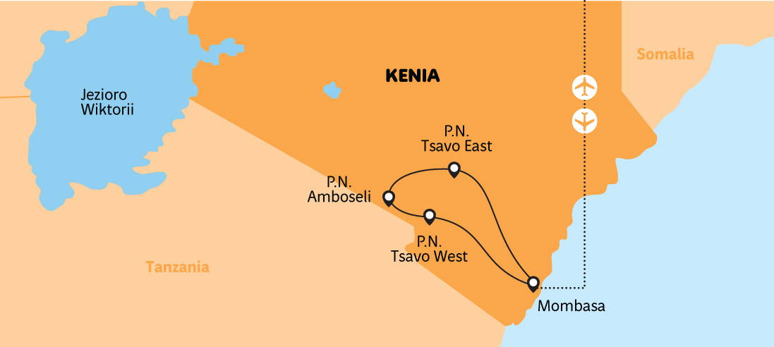Nejcharakterističtější zvířata Keni - sloni, žirafy, zebry, antilopy a lvi • střecha Afriky - Kilimandžáro • Tsavo West - baobaby, sloni a žirafy • prameny Mzima Springs • výlev lávy Shetani • Tsavo East - největší park v Keni • pláže Indického oceánu