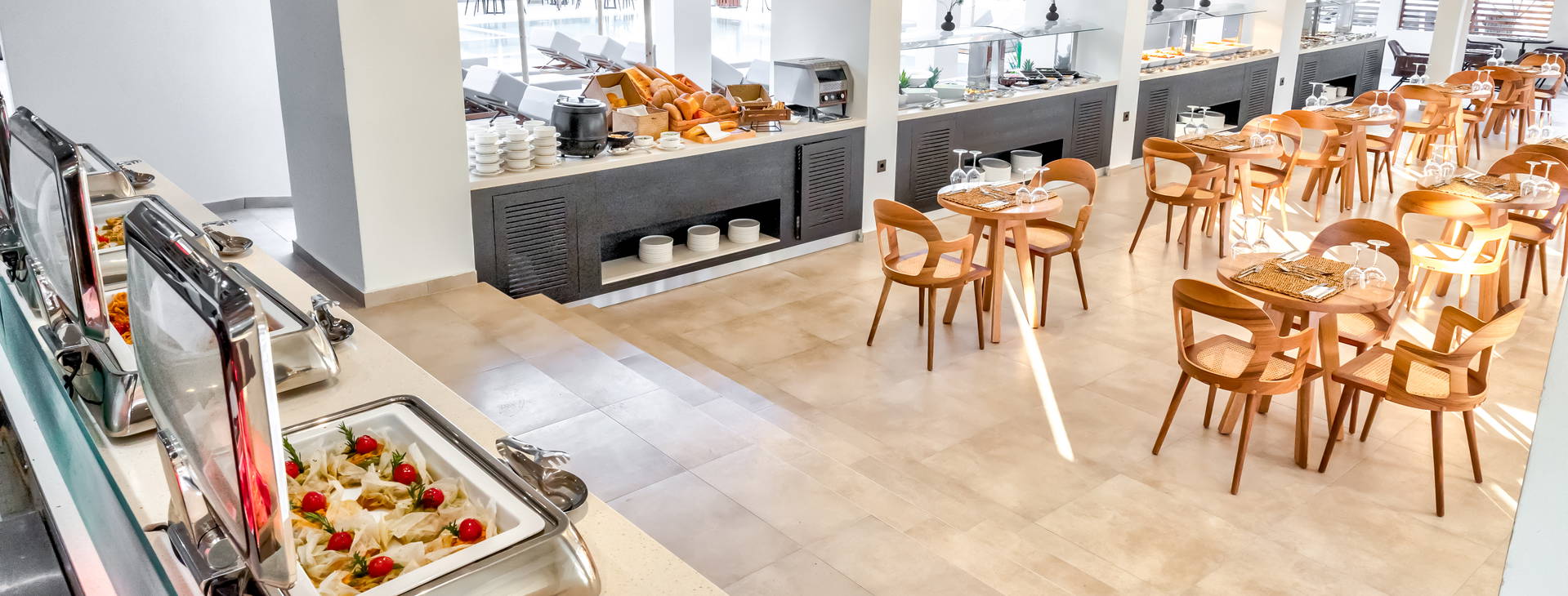 All inclusive: raňajky (07:00-10:00), obed (12:30-14:30) a večera (19:00-21:30) formou bufetu v hlavnej reštaurácii. K obedu a večeri sú k dispozícii nealkoholické nápoje, miestne pivo a víno. Skoré (06:00-07:00) a neskoré (10:00-11:00) kontinentálne raňajky. K dispozícii sú aj večere v ázijskej a gréckej reštaurácii a la carte (19:00-22:00) - nutná rezervácia. Občerstvenie a nápoje pri bazéne počas dňa ((11:00-18:00) a palacinky (11:00-17:00). Nealkoholické nápoje, miestne alkoholické nápoje a vybrané koktaily v hlavnom bare (17:30-23:00) a bare pri bazéne (10:30-23:00).