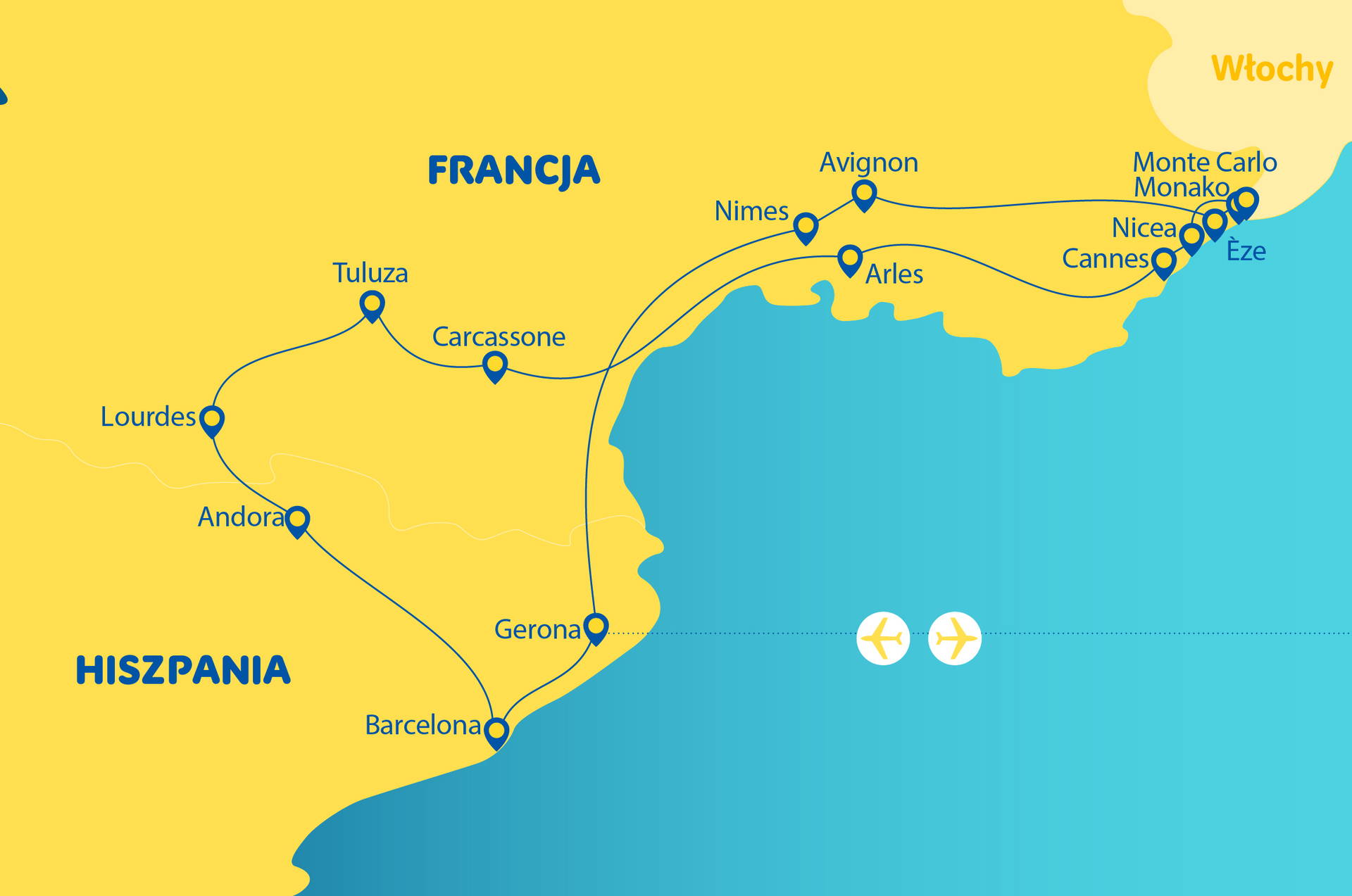 Monako a Azurové pobřeží • Barcelona a chrám Sagrada Família • Pyreneje a Andorra • Papežský palác v Avignonu a slavný most Pont du Gard • Carcassonne a Lurdy