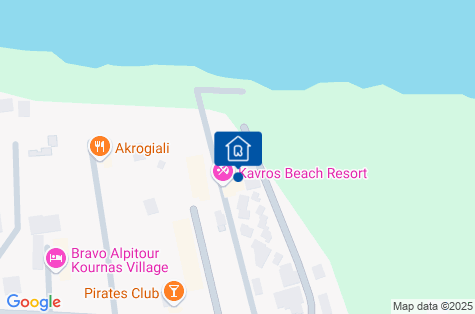 Hotel Kavros Beach sa nachádza v udržiavanej, peknej záhrade v malej dedinke Kavros, vo vzdialenosti približne 45 km od mesta Chania. Najbližšie obchody sa nachádzajú na druhej strane rušnej ulice (cca 200 m). Väčší výber obchodov a taverien, barov a kaviarní nájdete v Georgiopoulis (cca 4 km). Autobusová zastávka je vzdialená 150 m. Vo vzdialenosti 17 km sa nachádza krásne mesto Rethymnon - ľahko dostupné verejným autobusom. Hotel je vzdialený len 4 km od jazera Kournas - zaujímavého miesta na krátky výlet.