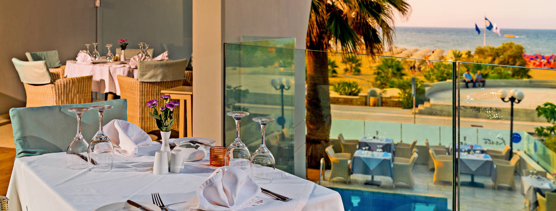 Raňajky (7:30-10:00) a večera (19:00-21:00) formou bohatého bufetu. V ponuke sú polievky, teplé a studené občerstvenie, široký výber šalátov a zeleniny, hlavné jedlá, show cooking a grécky kútik s miestnymi špecialitami. Obedy sú k dispozícii za príplatok. Nealkoholické nápoje a miestne alkoholické nápoje sa podávajú v bare (10:00-24:00).