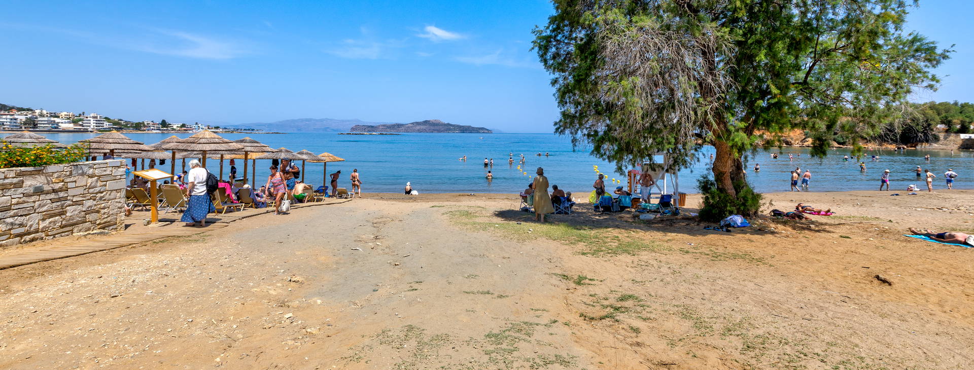 .Na piesočnatú pláž (tmavý, hrubý piesok) je to pár minút chôdze (cca 400 m). Ležadlá a slnečníky na pláži - za poplatok (cca 7 EUR/komplet: 2 ležadlá + slnečník).