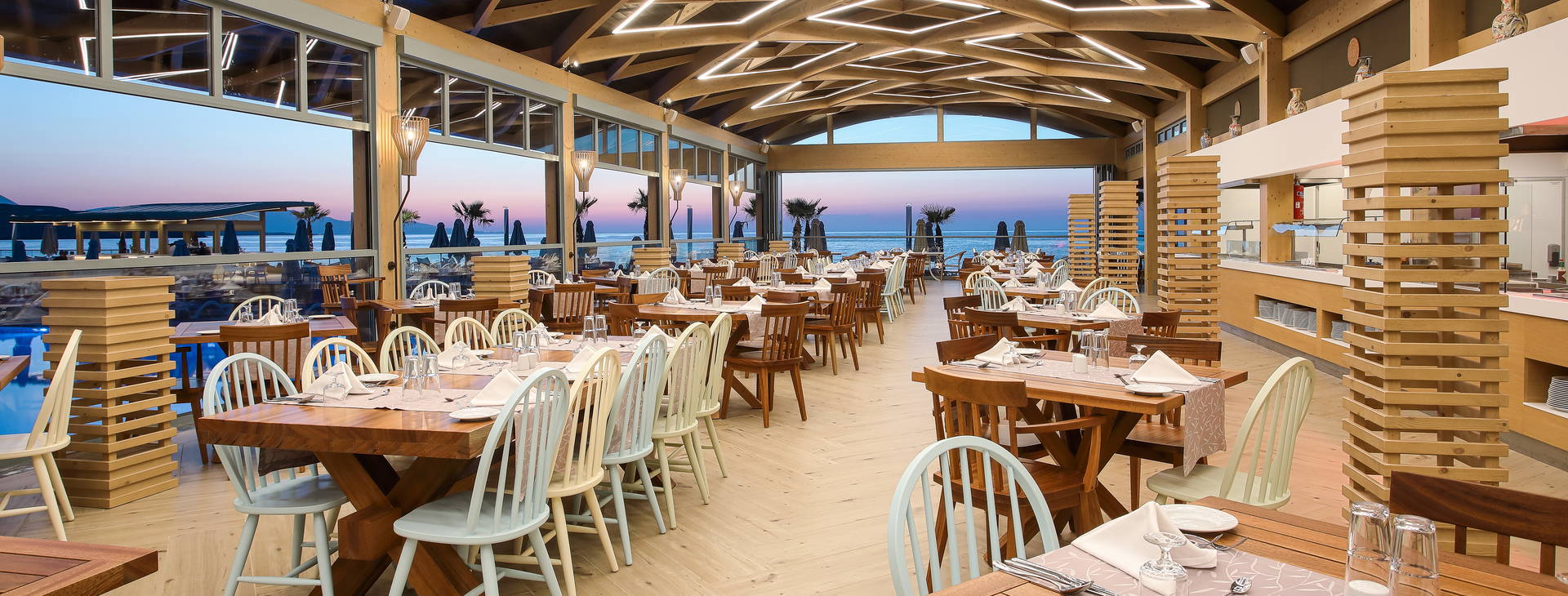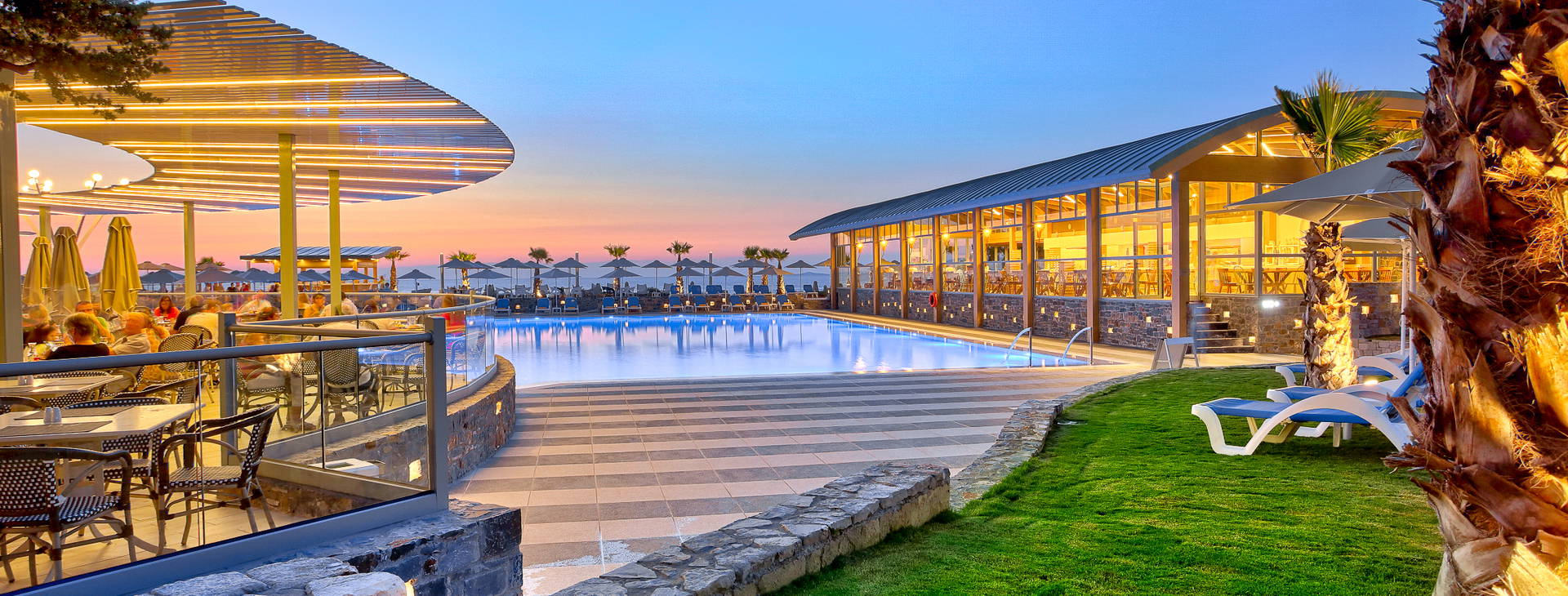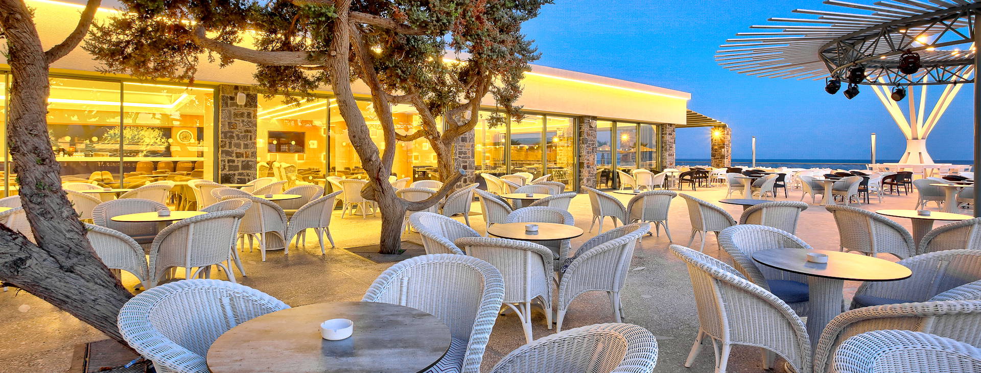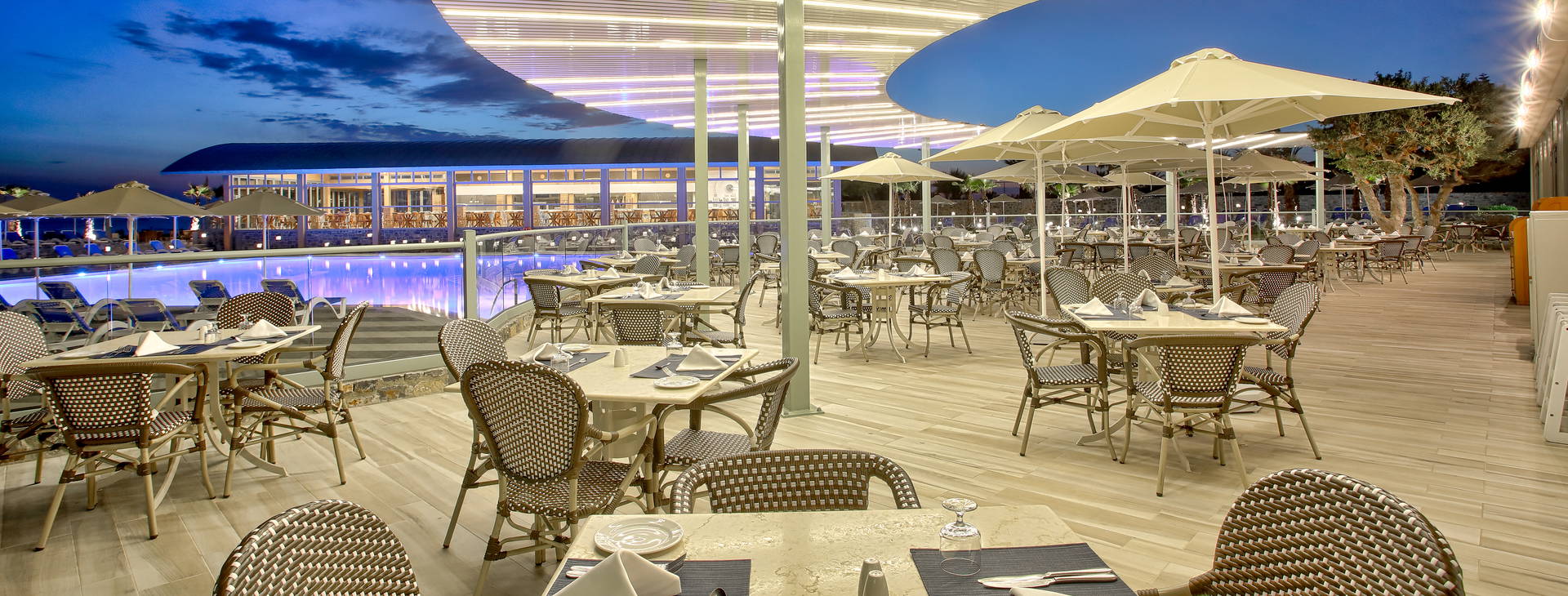 .All Inclusive zahŕňa raňajky, obedy a večere formou bufetu v hlavnej reštaurácii (k dispozícii sú detské stoličky). Počas dňa v baroch občerstvenie (10:00-12:00 a 15:30-18:0), zmrzlinu (11:00-18:00) a kávu a koláče (10:00-18:00). Počas jedla a v baroch (10:00-24:00) neobmedzené množstvo nealkoholických nápojov, ako aj miestnych alkoholických nápojov (pivo, víno, ouzo a raki). 1x za pobyt možnosť večere v ázijskej reštaurácii Minos (nutná predchádzajúca rezervácia)