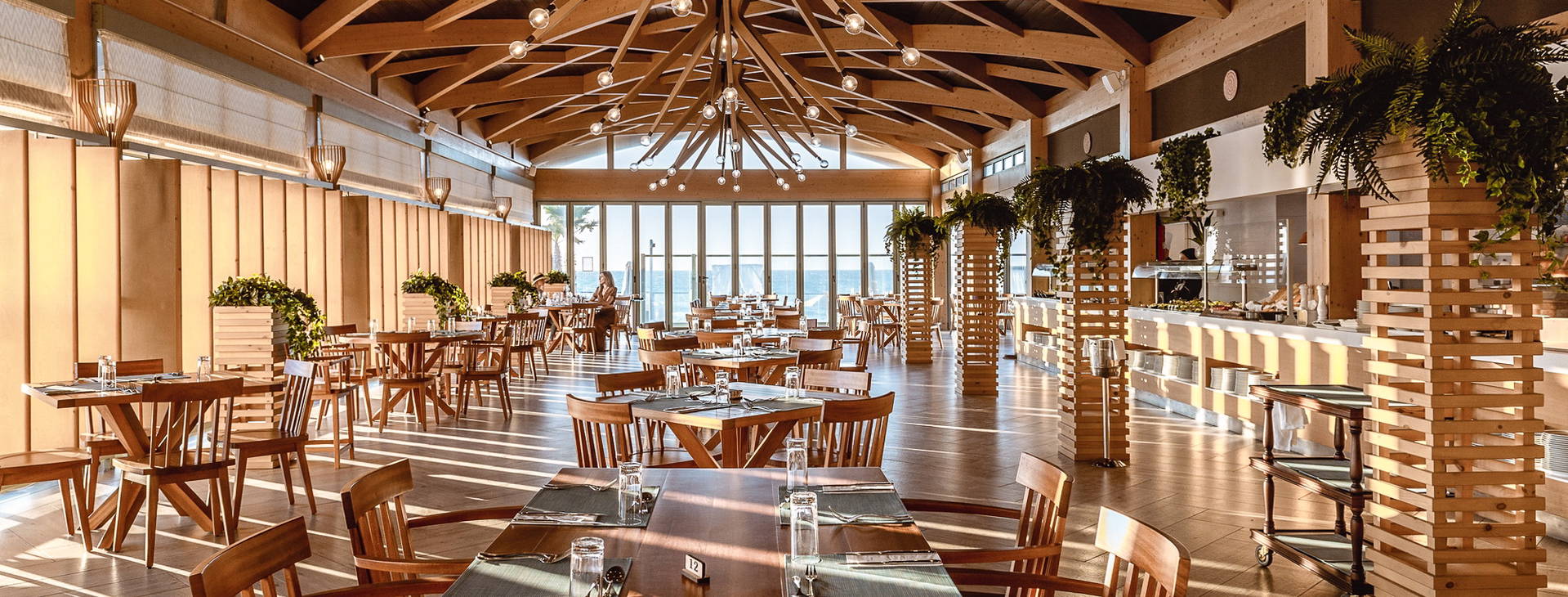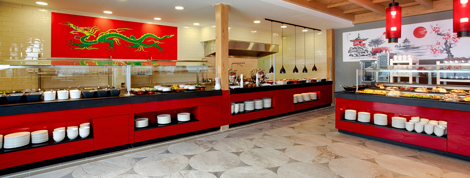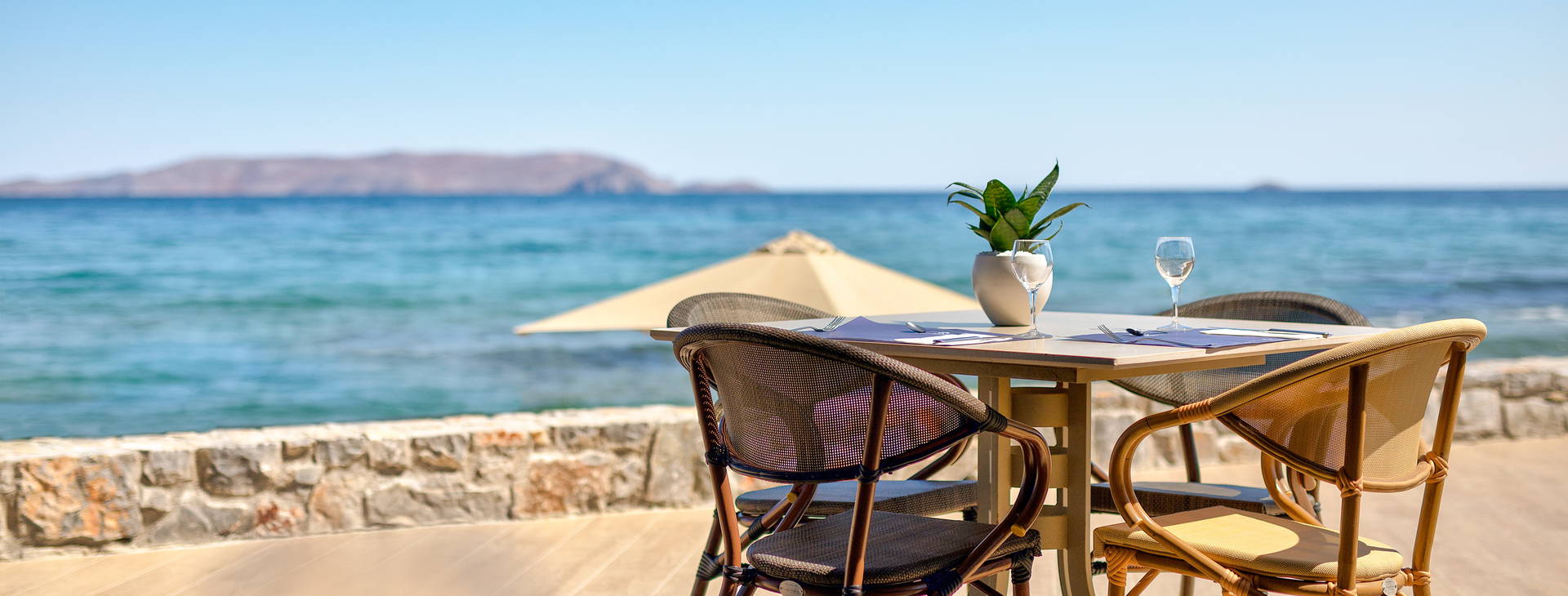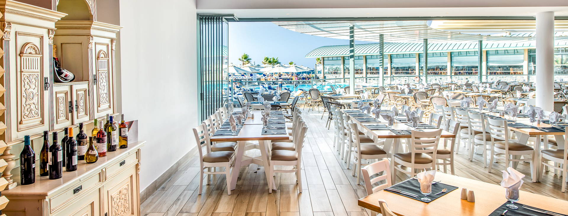 .All Inclusive zahŕňa raňajky, obedy a večere formou bufetu v hlavnej reštaurácii (k dispozícii sú detské stoličky). Počas dňa v baroch občerstvenie (10:00-12:00 a 15:30-18:0), zmrzlinu (11:00-18:00) a kávu a koláče (10:00-18:00). Počas jedla a v baroch (10:00-24:00) neobmedzené množstvo nealkoholických nápojov, ako aj miestnych alkoholických nápojov (pivo, víno, ouzo a raki). 1x za pobyt možnosť večere v ázijskej reštaurácii Minos (nutná predchádzajúca rezervácia)