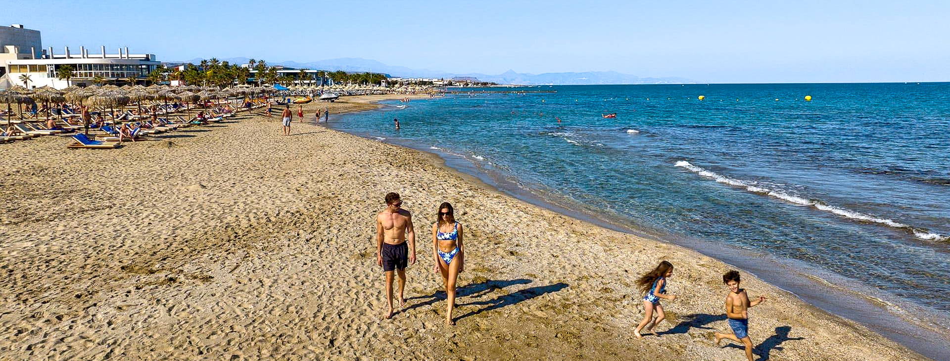 Pláž hotela Bella Beach na Kréte je piesočnatá a nachádza sa priamo pri hoteli (cez málo frekventovanú ulicu), takže hostia majú pohodlný prístup k moru. Pláž ponúka pozvoľný zostup do vody, takže je ideálna pre dospelých aj deti. Pre pohodlie a komfort dovolenkárov je k dispozícii bezplatný plážový servis.