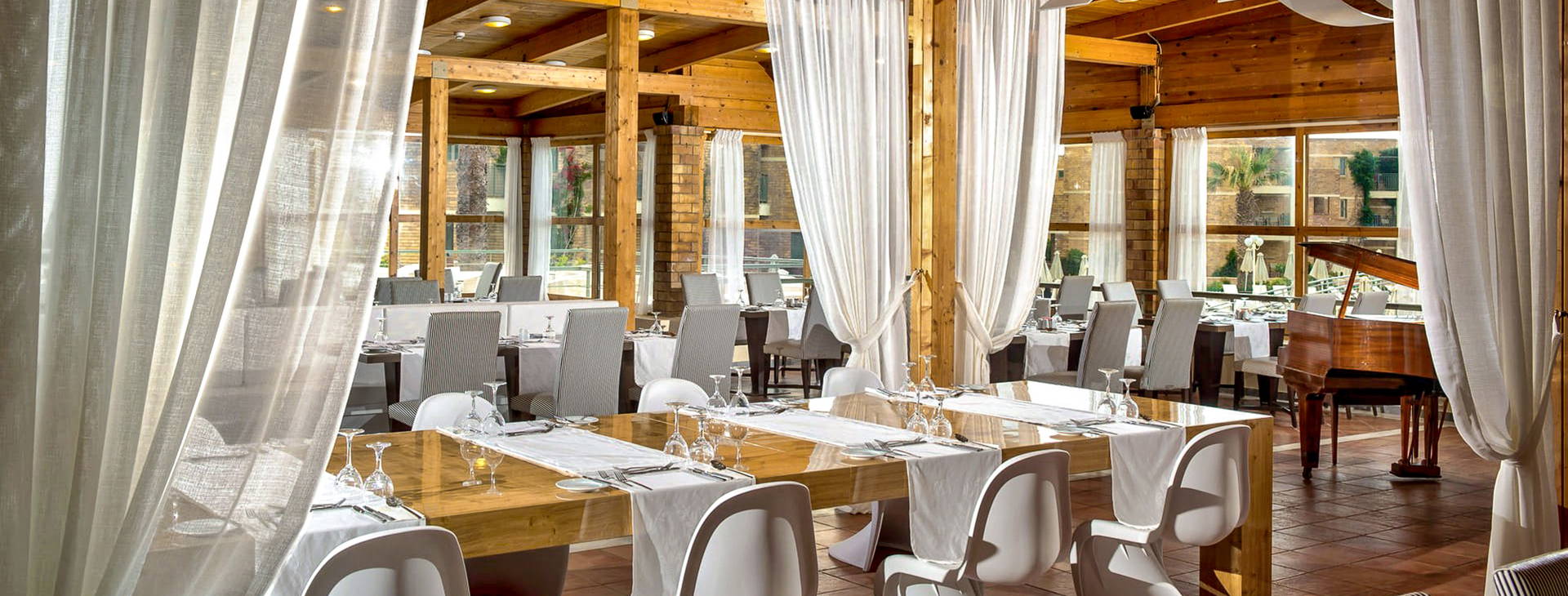 Všetko od 10:00 do 23:00. Pergola, ktorá podáva raňajky (07:30-10:00, neskorý obed sa podáva od 10:00-10:30), obed (12:30-14:30) a večeru (18:30-21:00) formou bufetu. Reštaurácia Olive Tree ponúka jedlá stredomorskej kuchyne à la carte. V reštaurácii Orion sa podávajú jedlá gréckej kuchyne (19:00-21:30). Nealkoholické nápoje a miestne a medzinárodné alkoholické nápoje - raki, ouzo, brandy gin, vodka, rum, tequila, whisky sa podávajú v štyroch baroch. Na večeru sa vyžaduje formálne oblečenie (dlhé nohavice pre mužov).