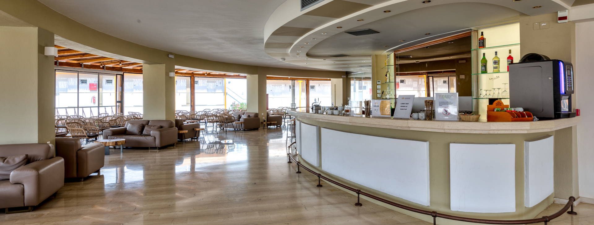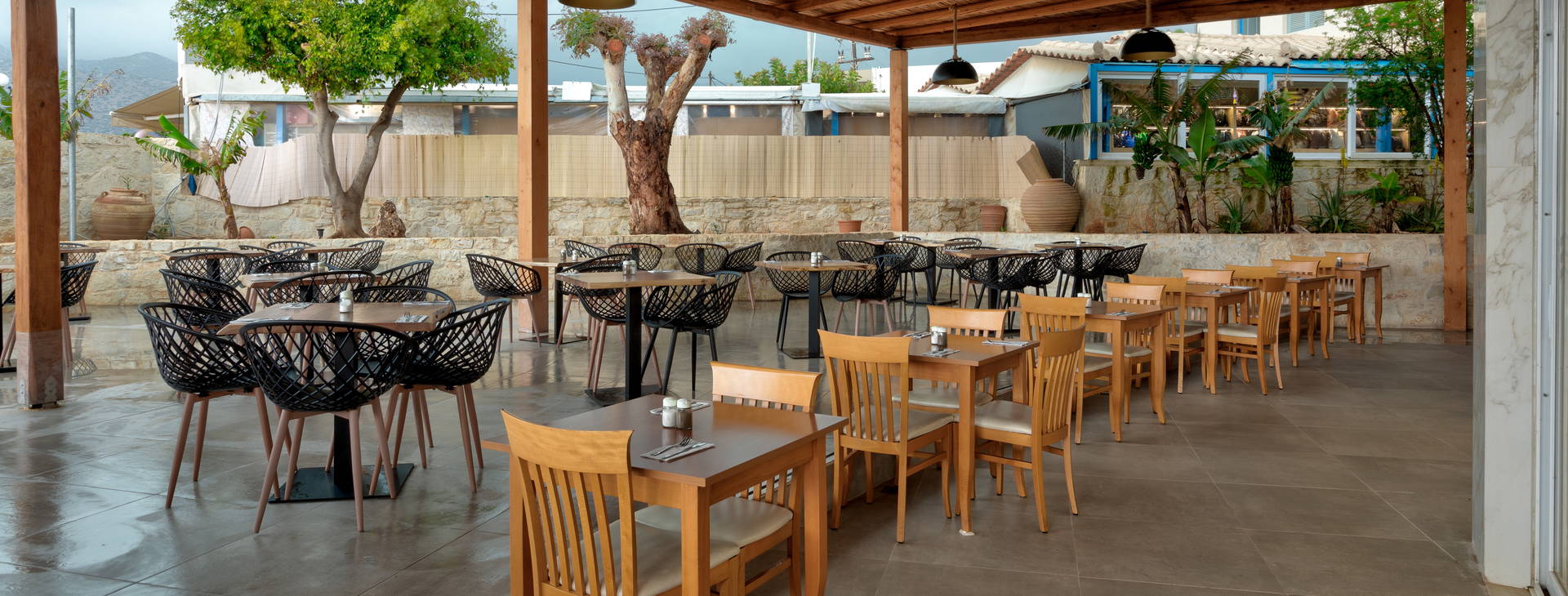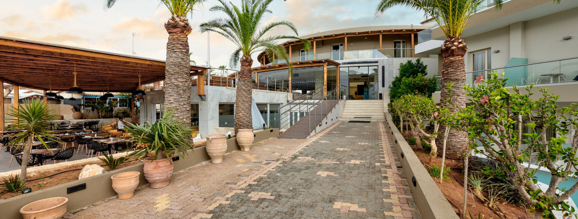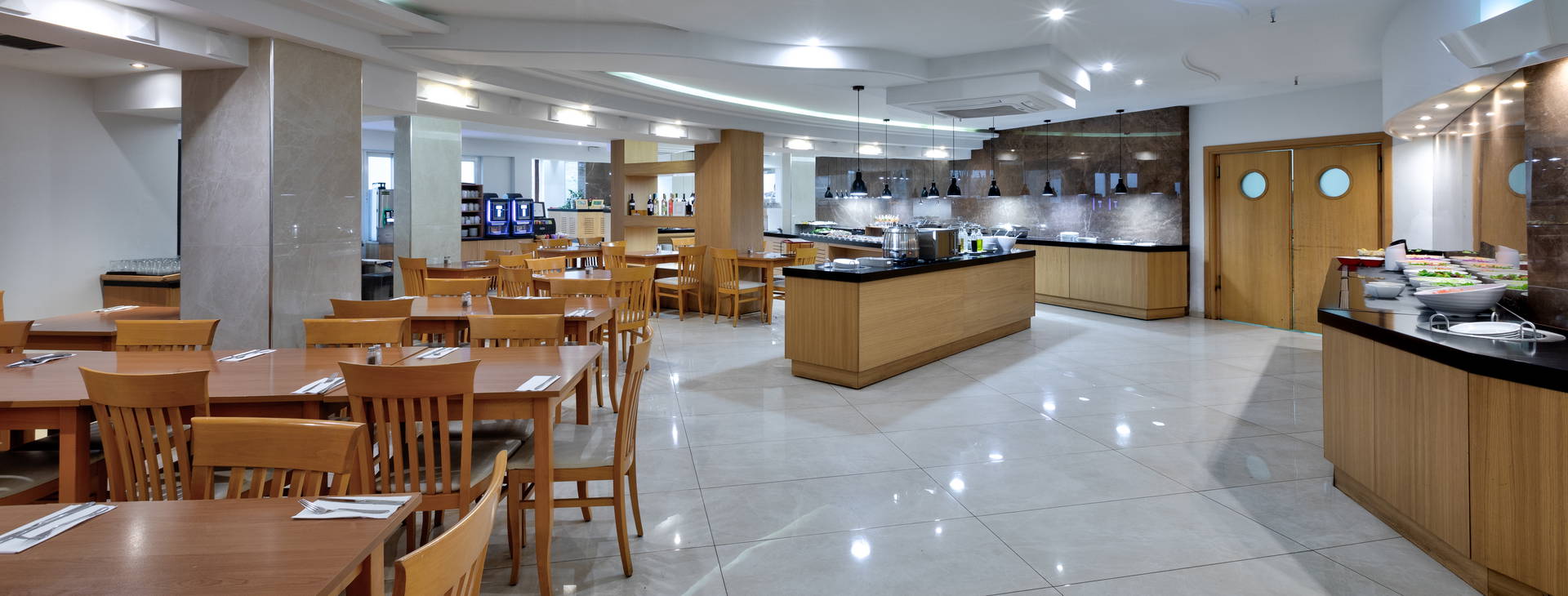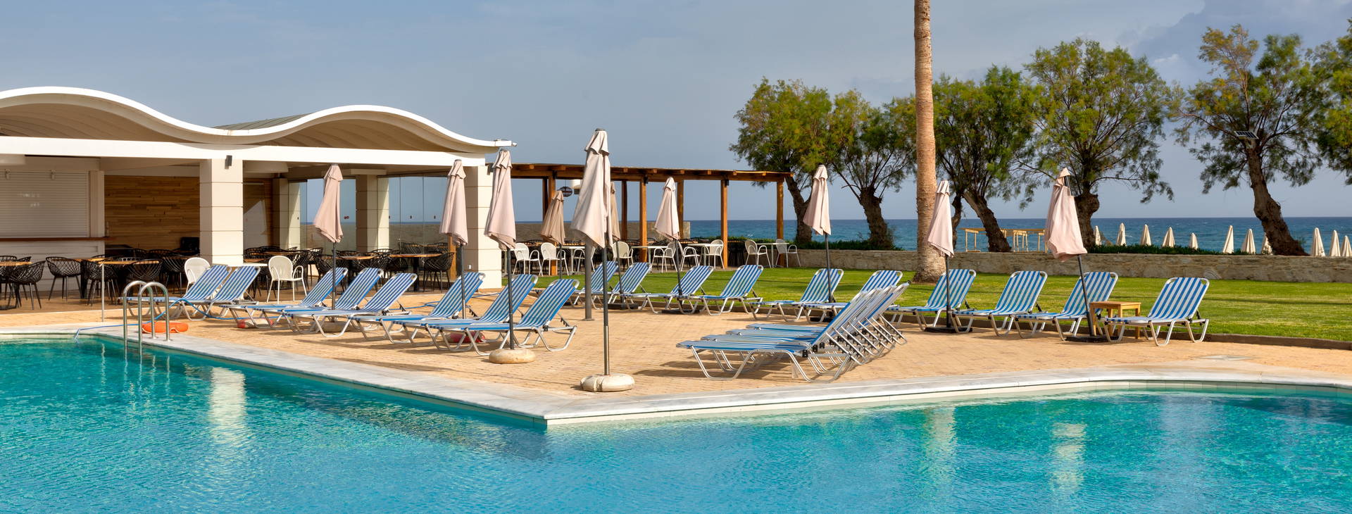 All inclusive bufet. Raňajky (7:30 - 10:00), neskorý obed (10:00 - 10:30), obed (12:30 - 14:30), večera (18:30 - 21:30). Kulinárske ukážky počas raňajok a obeda. Tematické večery (napr. grécky, krétsky, taliansky atď.). Hlavný bar (17:00 - 01:00) Bar pri bazéne (10:00 - 01:00). Nápoje po 23:00 podávané za príplatok. Denne: káva pri bazéne, podávané alkoholické a nealkoholické nápoje, pivo, občerstvenie a zákusky. Nápoje all inclusive: káva, čaj, importované pivo, biele a červené víno, miestne čapované pivo, miestne alkoholické nápoje a koktaily.