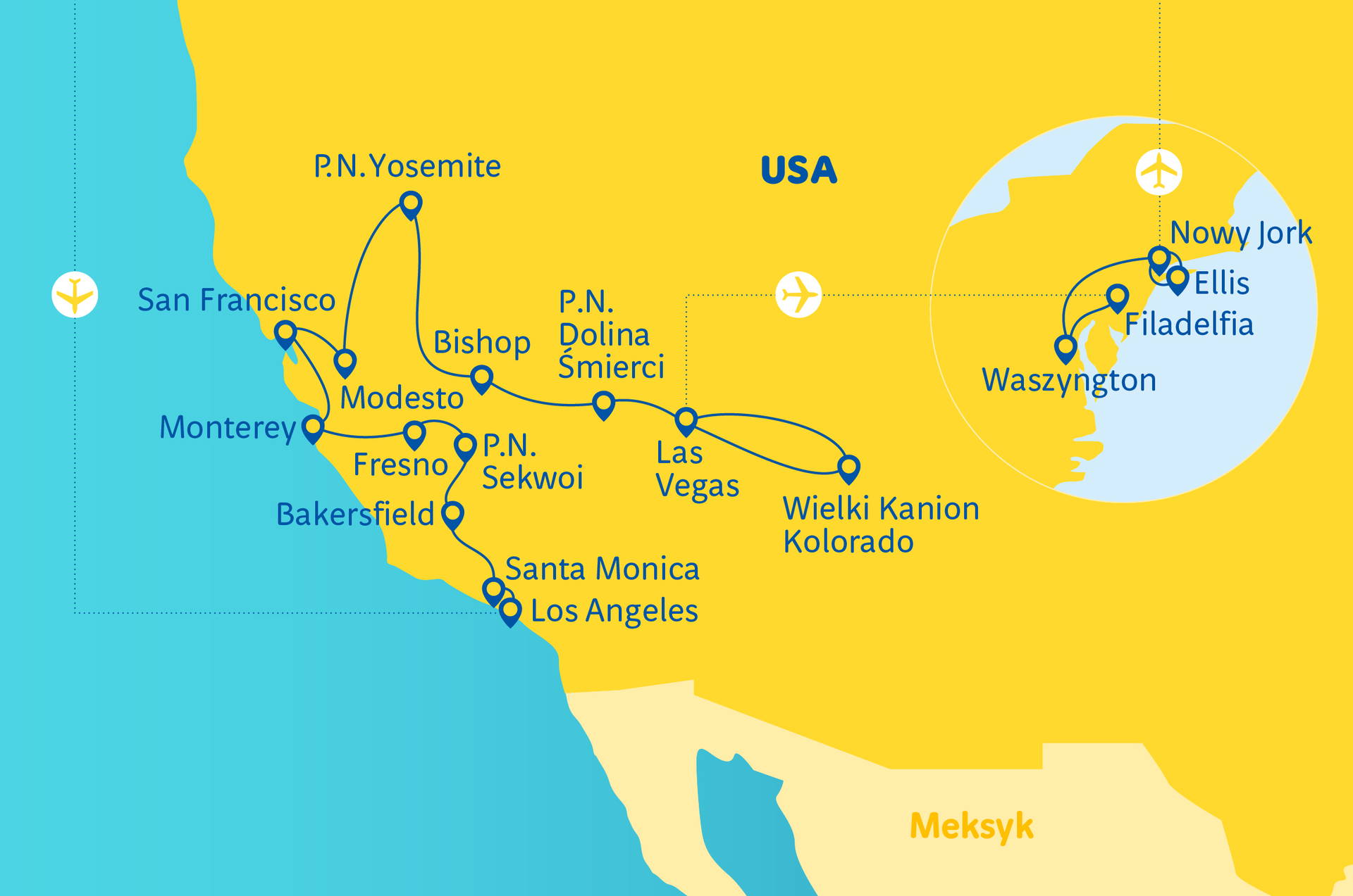 Základní cena zahrnuje: let pravidelnou linkou z Varšavy do Los Angeles a z New Yorku do Varšavy, vnitřní přelet: Las Vegas (nebo okolí) - New York, letištní taxy, ubytování (celkem 10 nocí), stravování: americké snídaně, transfery klimatizovaným autokarem, služby polského zástupce během odbavení na letišti v Polsku, služby polského průvodce, pojištění TU Europa varianta základní (úrazové pojištění a léčebné výlohy, trvalé následky, asistenční služby a pojištění zavazadel).