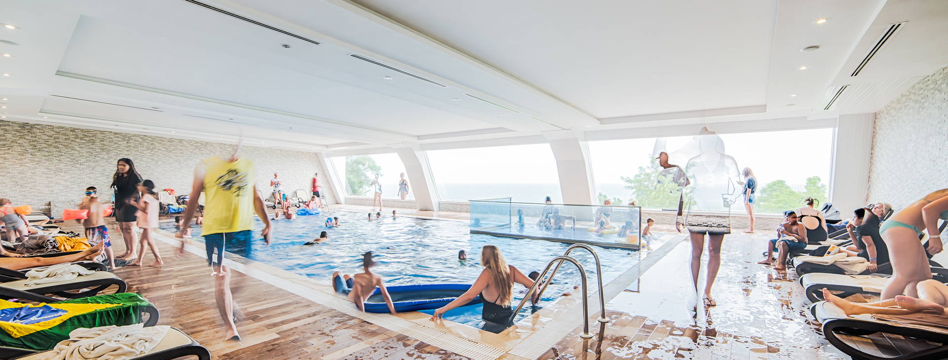 Hodinová recepcia, 4 výťahy, aquapark so šmykľavkami (cca 10 km) rôznych veľkostí pre dospelých a deti; otvorený sezónne v závislosti od počasia), veľký vonkajší bazén s nekonečnou lagúnou so sladkou vodou a detským brodítkom a vnútorný bazén, bezplatné ležadlá a slnečníky pri bazénoch a na pláži, multifunkčné ihrisko (volejbal, basketbal), ihrisko na plážový volejbal, tenisový kurt, zmenáreň, požičovňa bicyklov (za poplatok), obchod, bankomat. Hlavná reštaurácia s vonkajšou terasou a výhľadom na jazero, reštaurácia a la carte (za poplatok), plážový bar (za poplatok), lobby bar a bar v aquaparku (za poplatok).