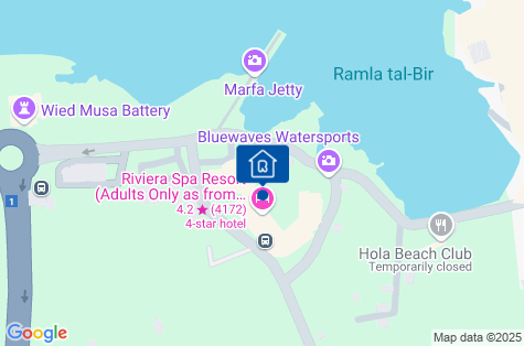 Hotel sa nachádza v severnej časti ostrova Malta v mestečku Mellieha, neďaleko zálivu Marfa. V blízkosti sa nachádzajú historické pamiatky (batéria Wied Musa - 300 metrov, veža svätej Agáty - približne 2 km). Hotel je vzdialený približne 2 km od najbližšej pláže a reštaurácií, 3,5 km od pláže v zálive Mellieha a 30 km od letiska.