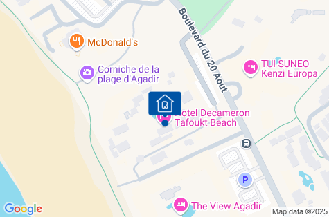 Komfortný štvorhviezdičkový hotel sa nachádza priamo pri Atlantickom oceáne, približne 1 km od turistického centra, barov, reštaurácií a obchodov. Letisko Agadir je vzdialené približne 30 km.