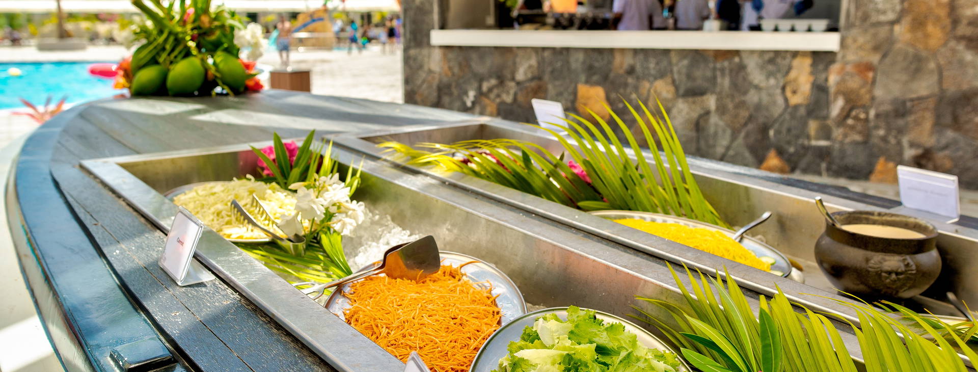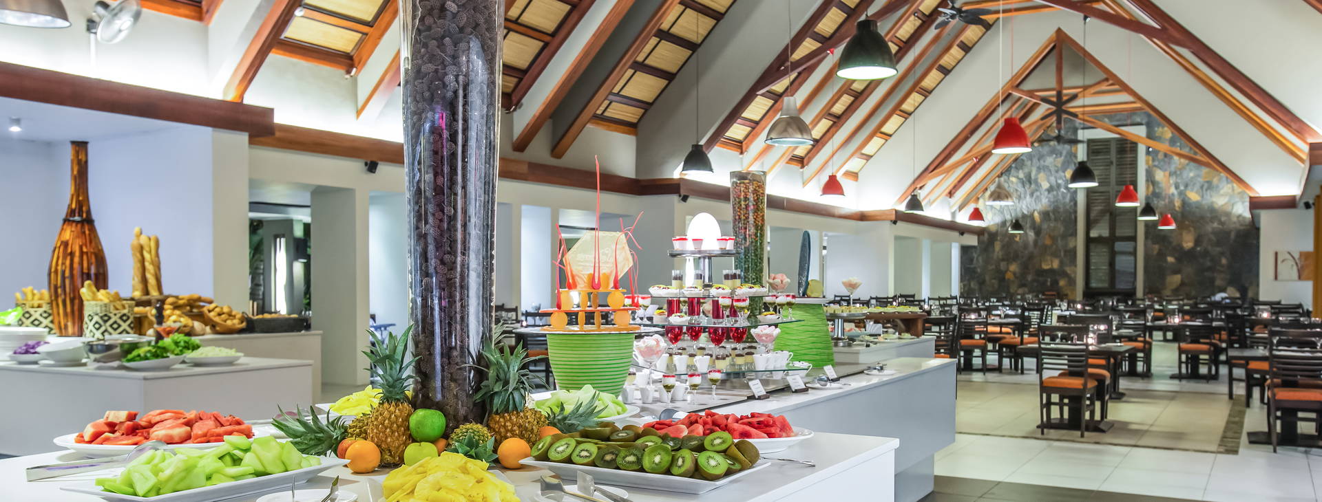 Všetko zahŕňa: raňajky, obed a večeru formou bufetu, popoludňajší čaj: koláče, káva a čaj (14:30-17:00). Neobmedzené množstvo nealkoholických a miestnych alkoholických nápojov (11:00-23:00). V hlavnej bufetovej reštaurácii sa podávajú jedlá európskej, kreolskej, ázijskej a indickej kuchyne. Ďalšou atrakciou sú stanice, kde kuchári pripravujú jedlá pre hostí za chodu.