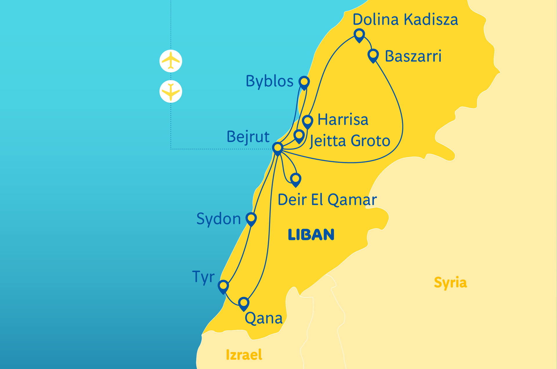 Bejrút - Paříž Blízkého východu • Jeitta Groto - pohádkové jeskyně • Byblos - nejstarší obydlené město světa (UNESCO) • Libanonské hory • hrad Bejteddin - sídlo prezidenta Libanonu • Sidon před 6000 lety • Tyr (UNESCO) • Kana - zázrak přeměny vody na víno