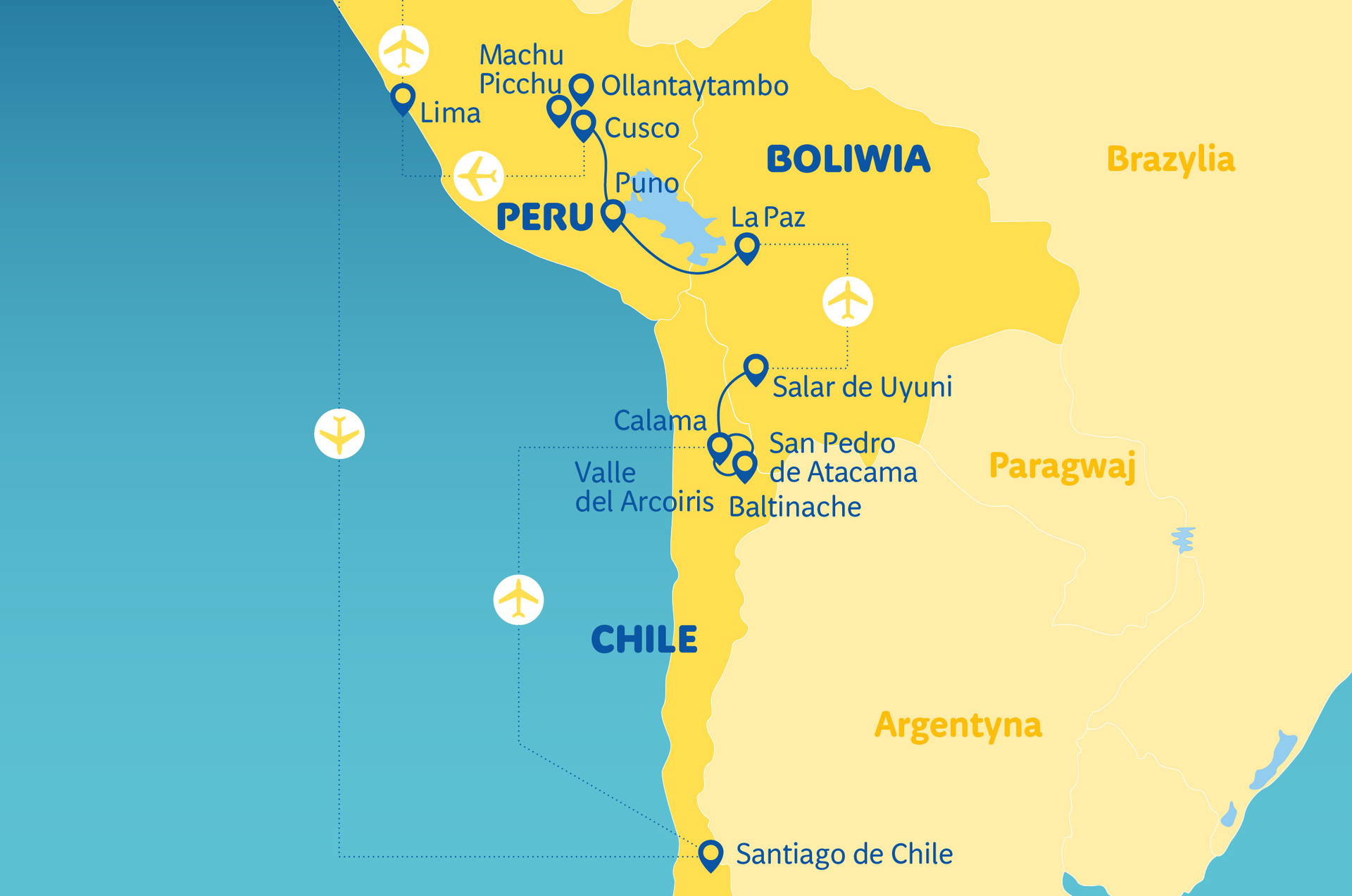 Lima • Machu Picchu • Cuzco • jezero Titicaca - plovoucí ostrovy Uros • Santiago de Chile • poušť Atacama • Měsíční údolí a Údolí smrti - solné pláně a gejzíry • krásná, ale neznámá Bolívie - La Paz, Tiwanaku, Salar de Uyuni • pohádkově barevné laguny